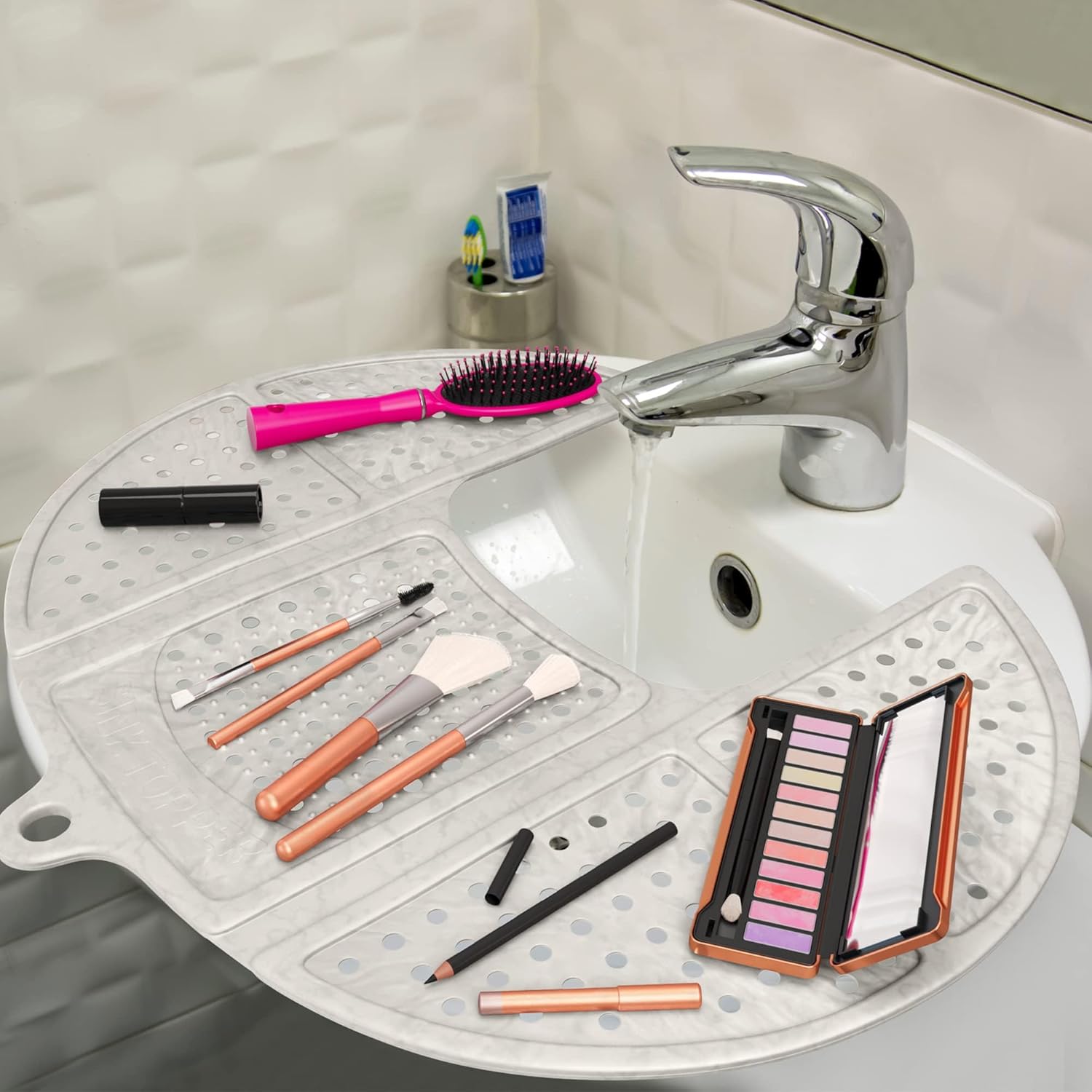 - MULTIPURPOSE SINK SOLUTION – Upgrade your sink area with this foldable silicone topper that adds extra space, protects against heat up to 480°F, and keeps essentials organized. Slip-resistant and strong enough to hold up to 7 lbs, it’s perfect for makeup brushes, hot tools, or cleaning items. Wondering if it fits your sink? Available in Small and Large sizes—just measure before ordering for the best fit at home or while traveling.