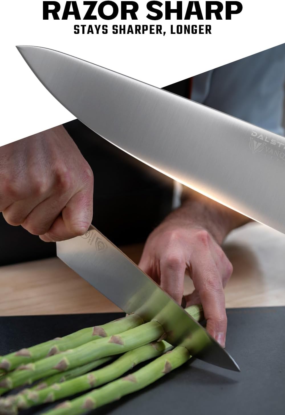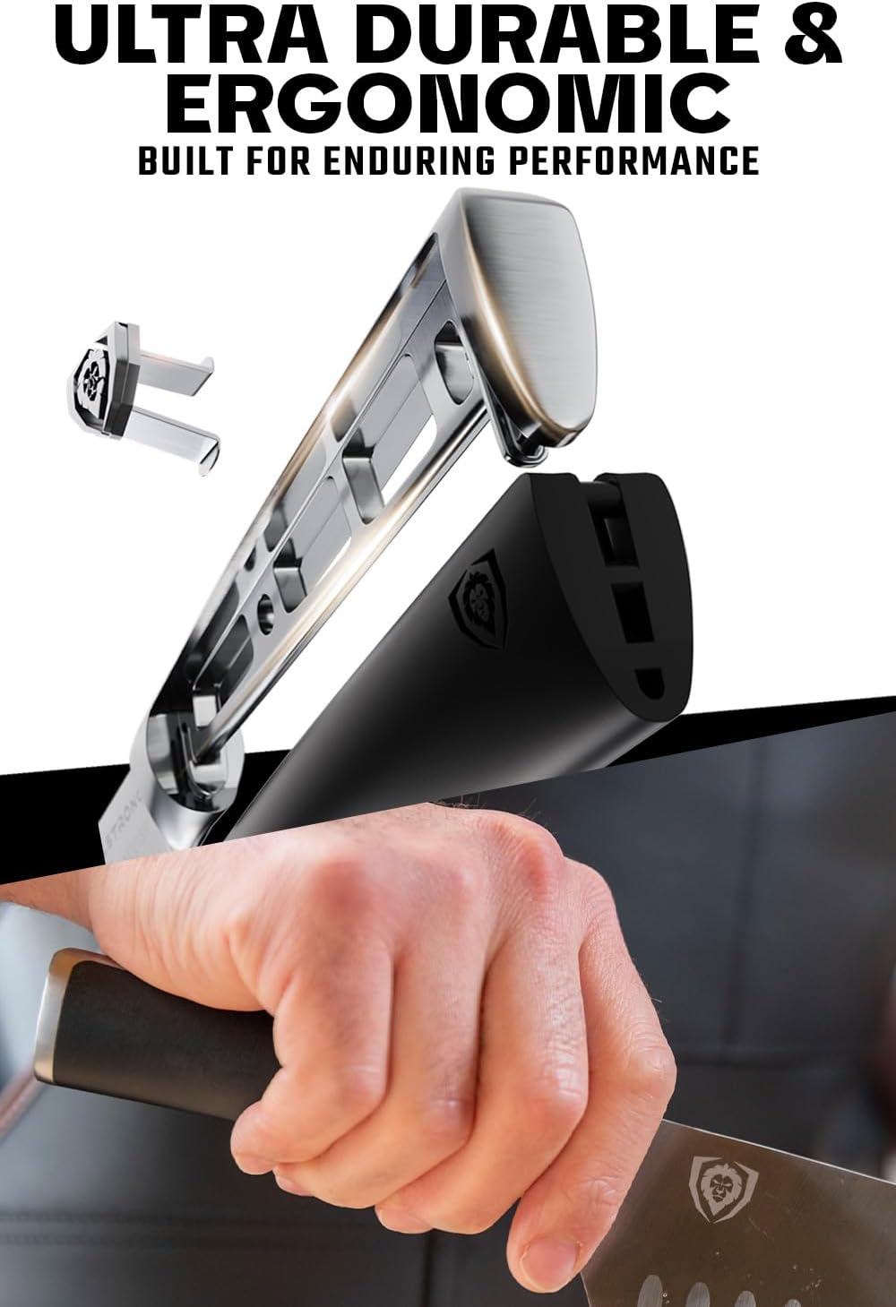 - Elegant Design and Functionality: The midnight black POM handle—highly impervious to water and heat—ensures comfort and durability. For an added touch of sophistication, the Dalstrong Lion Head pin on each handle is a reminder of the quality you can trust. With the custom-fit sheath, you can store it safely in your cupboard or take it on the go. This combination of materials and design provides both functionality and elegance, making it an essential addition to your kitchen.
