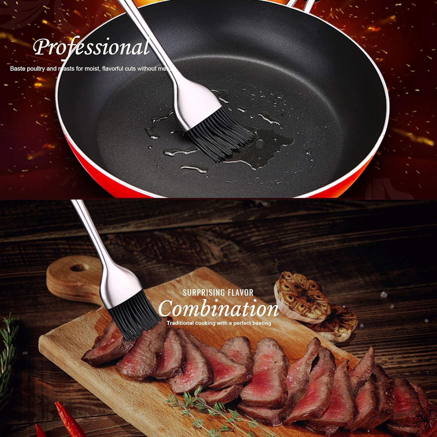 - STAINLESS STEEL BBQ BASTING BRUSH - Enjoy more flavor with less mess. The thick silicone bristles of our brush boast a unique shape that allows them to capture and retain basting liquid. Great for slathering sauces on grilled meat or basting roasts with juices, this essential tool is dishwasher safe for easy cleanup.