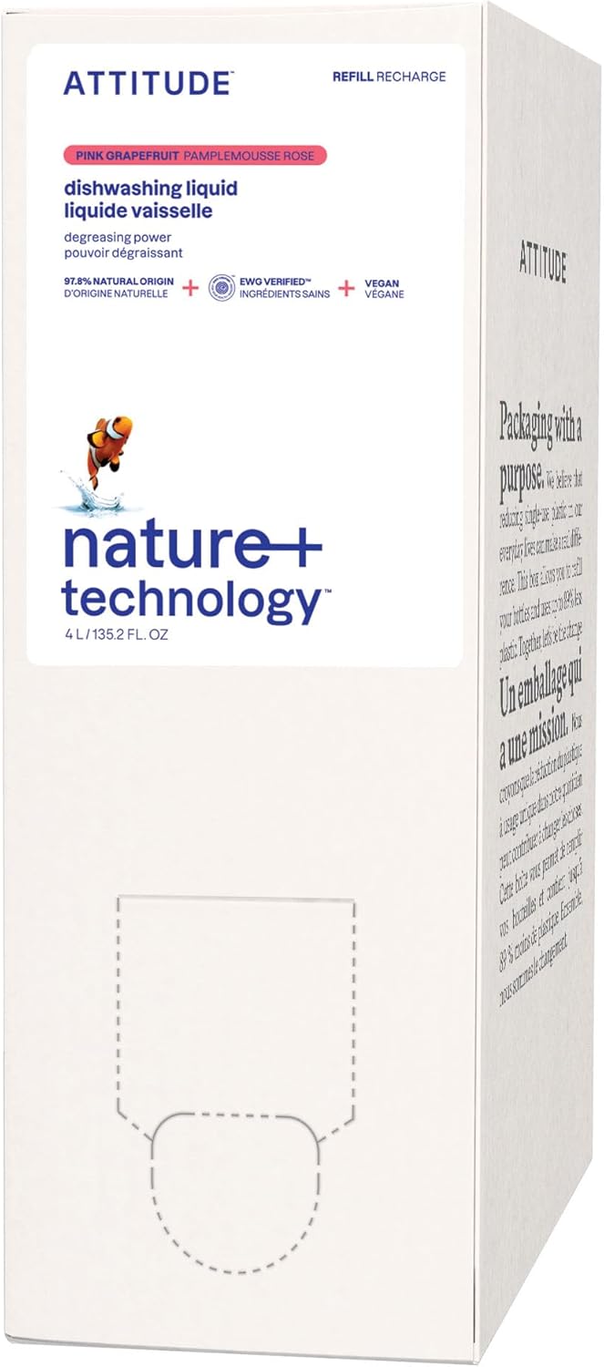 ATTITUDE Dish Soap Refill, EWG Verified, Plant-Based & Vegan Dishwashing Liquid, Naturally Derived, Pink Grapefruit, 135.3 Fl Oz