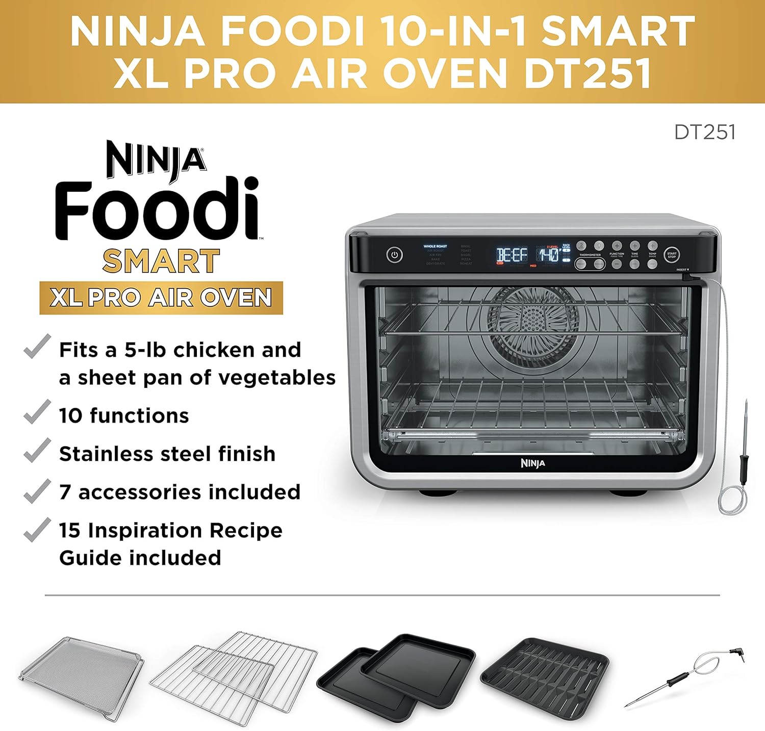 NINJA DT251 Foodi 10-in-1 Smart Air Fry Digital Countertop Convection Toaster Oven with Thermometer XL Capacity and a Stainless Steel Finish (Renewed)