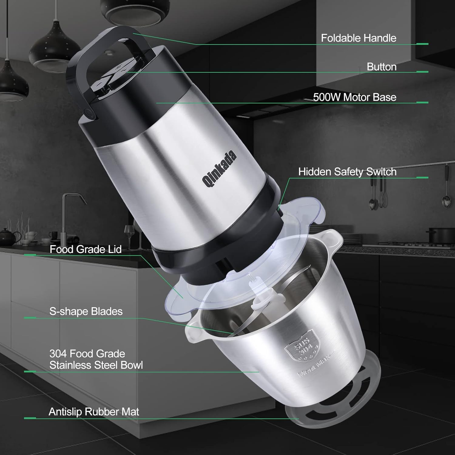 - 🥦500W Powerful Motor & Quick Chopping:With the 500W powerful motor & Double Layer Sharp Bladez, Qinkada Electric Meat Chopper can crush all kinds of ingredients easily and quickly.