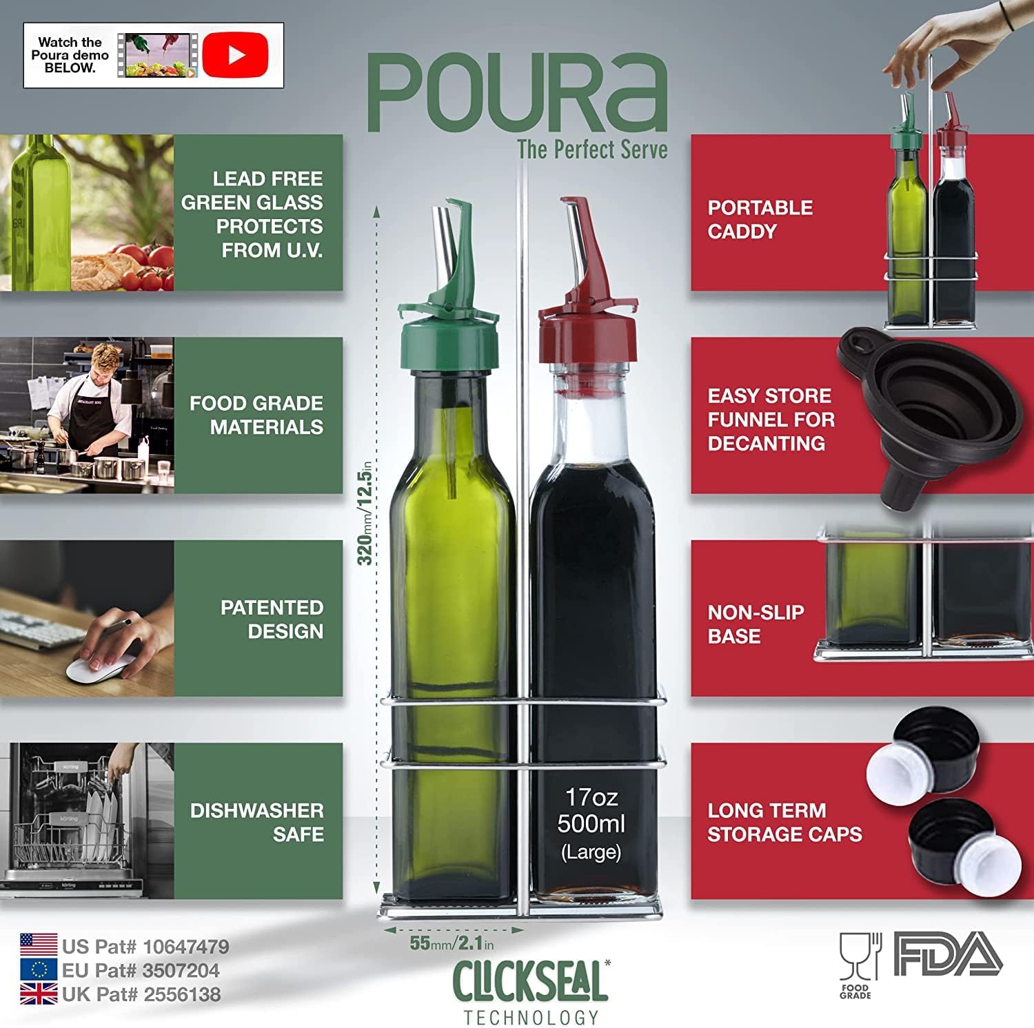 - ✅ TRANSFORM YOUR KITCHEN WORKFLOW - Poura's Advanced ClickSeal Technology Pourers are designed by a top chef & product designer team to look attractive in your kitchen & work for you while cooking - built to last with industrial quality materials. Both elegant & easy to use with a non-slip base for extra security for your olive oil and vinegar dispenser set.