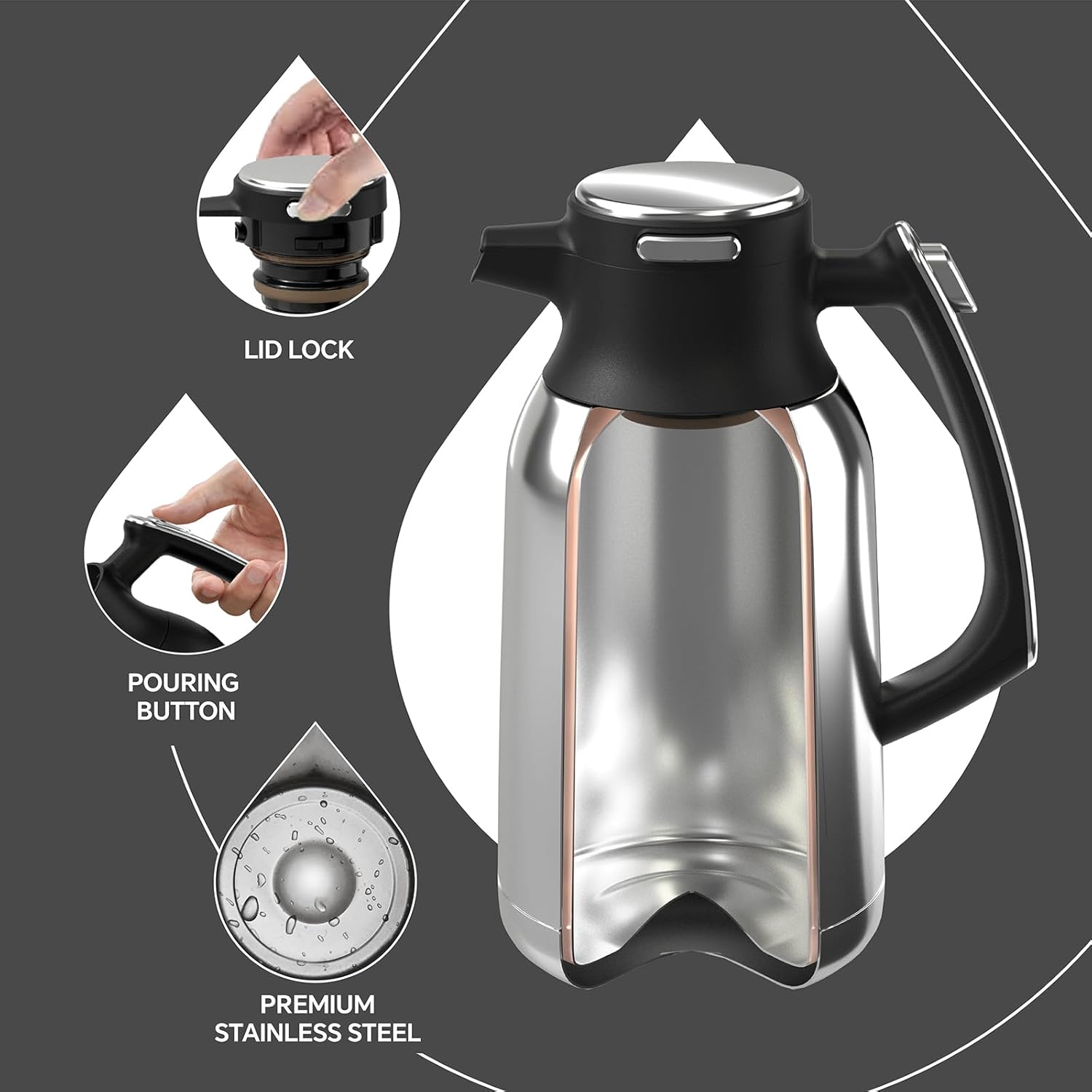 - Unique Exterior - Designed by professional designers, these coffee carafes have a unique and elegant appearance which combines noble and modern elements.Double-wall stainless steel vacuum insulation allows for maximum temperature retention.
