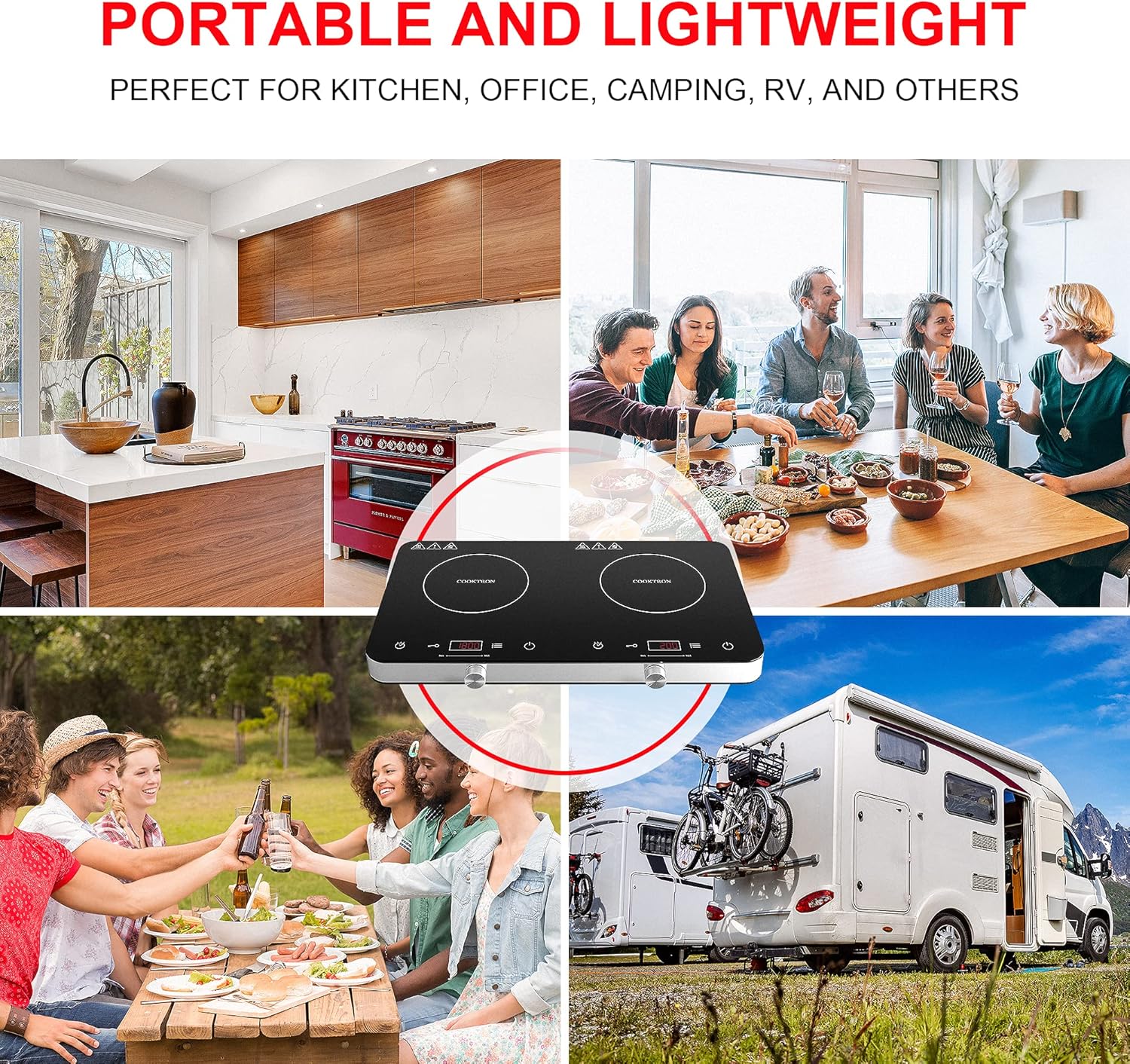 - πππππ ππππ πππππ πππππππππ πππππππ:1800w quick heating double induction cooktop is faster than a standard double induction burner. Compared with traditional induction stove, it has a higher heat conduction effect, which meets various cooking needs, such as steaming, boiling, fried, frying, slow stewing. Through the knob operation, we can control the heat more accurately, and the ventilation duct design can better dissipate heat and prevent damage to the countertop.