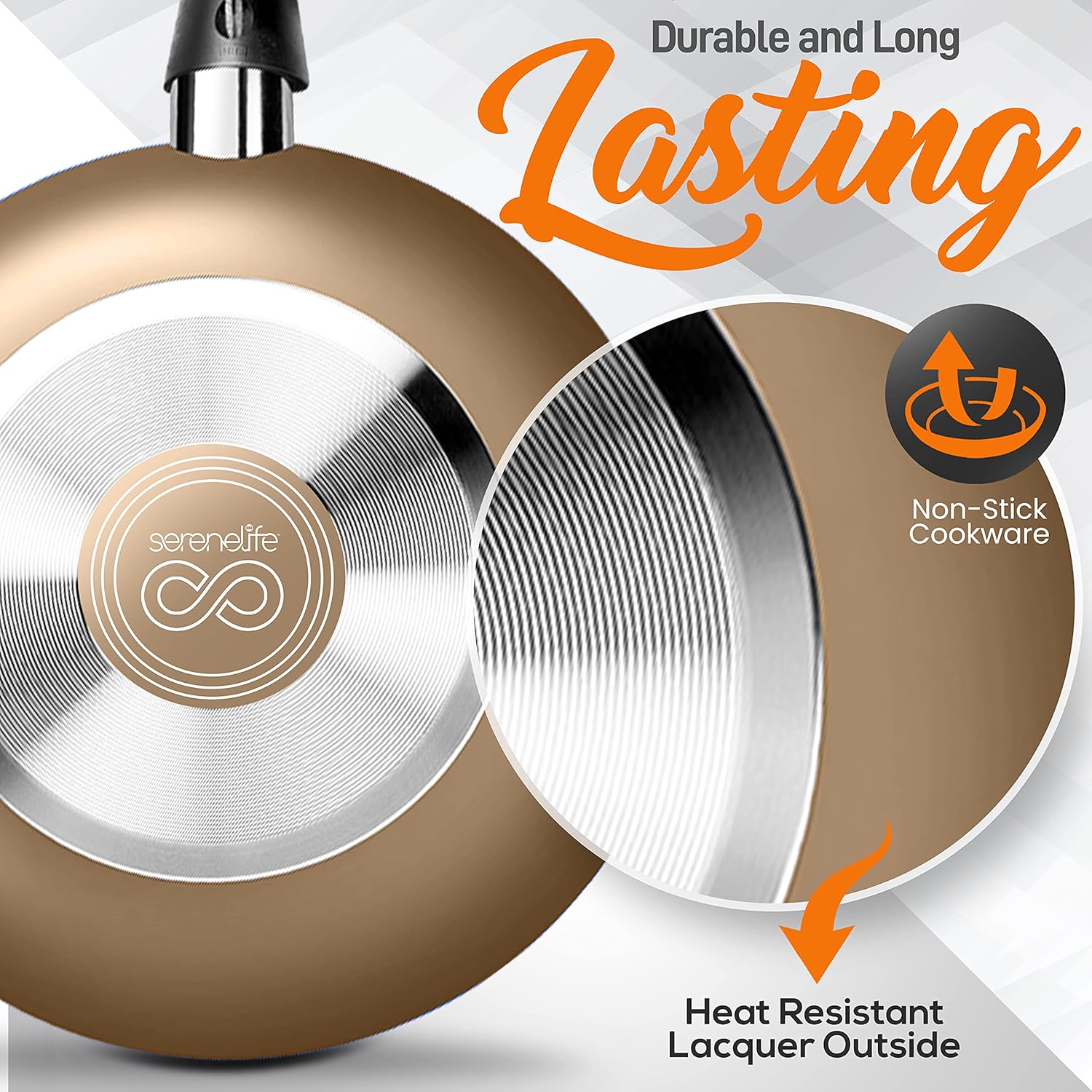- 15-PIECE SET: The SereneLife Cookware Set features 15pc nonstick cookware set which includes 0.89 & 1.90qt sauce pots w/ lids, 4.70qt dutch oven pot w/ lid, 2.5qt saute pan w/ lid, 8” & 10” fry pans, spoon, spatula, pasta server, ladle, and egg whisk