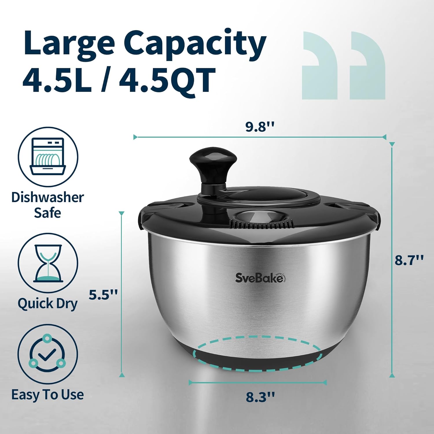 Stainless Steel Salad Spinner, 4.2 Qt Vegetable Washer, BPA-Free Lettuce Dryer with Crank Design, Dishwasher Safe, Non-Slip Base - Black Lid