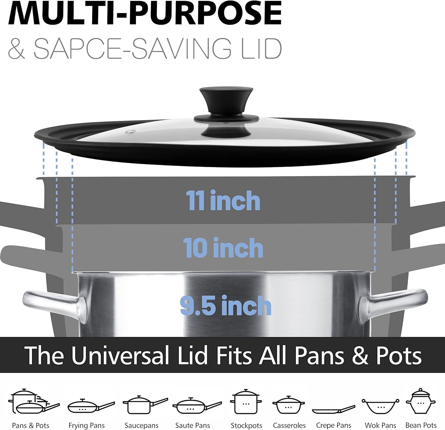 Anaeat Silicone Universal Lid for Pots, Pans and Skillets - Tempered Glass Covered with Heat Resistant Silicone Rim Fits 9.5", 10" and 11" Diameter Cookware -Easy to Use Replacement Frying Pan Cover
