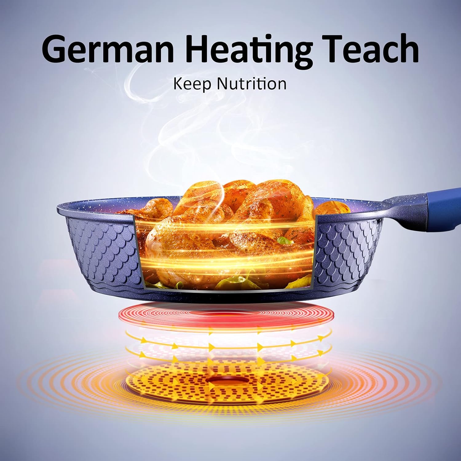 - [UNIQUE DESIGN, QUALITY HANDLE& LID] The German special-designed stylish gradient USA BLUE color makes a bold style statement. Silicon-sealed Lid & Knob seal in heat and moisture more efficiently, helping retain the flavor & nutrition of the food. With the clear lid, you can monitor your food while you steam it to prevent burning or overcooking. No need to worry about grease splashing out of the nonstick frying pan while cooking.