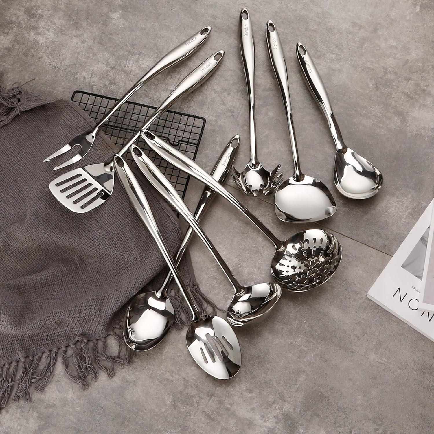 - 9-Pieces, 1 meat fork, 1 solid serving spoon, 1 slotted serving spoon, 1 spatula, 1 skimmer spoon, 1 slotted spatula turner, 1 large spoon, 1 spaghetti spoon, 1 soup ladle. These premium utensils are safe to use for cooking any type of food, It is also a great gift for friends and family who love cooking with metal kitchen utensils, and be sure to be asked where you bought it