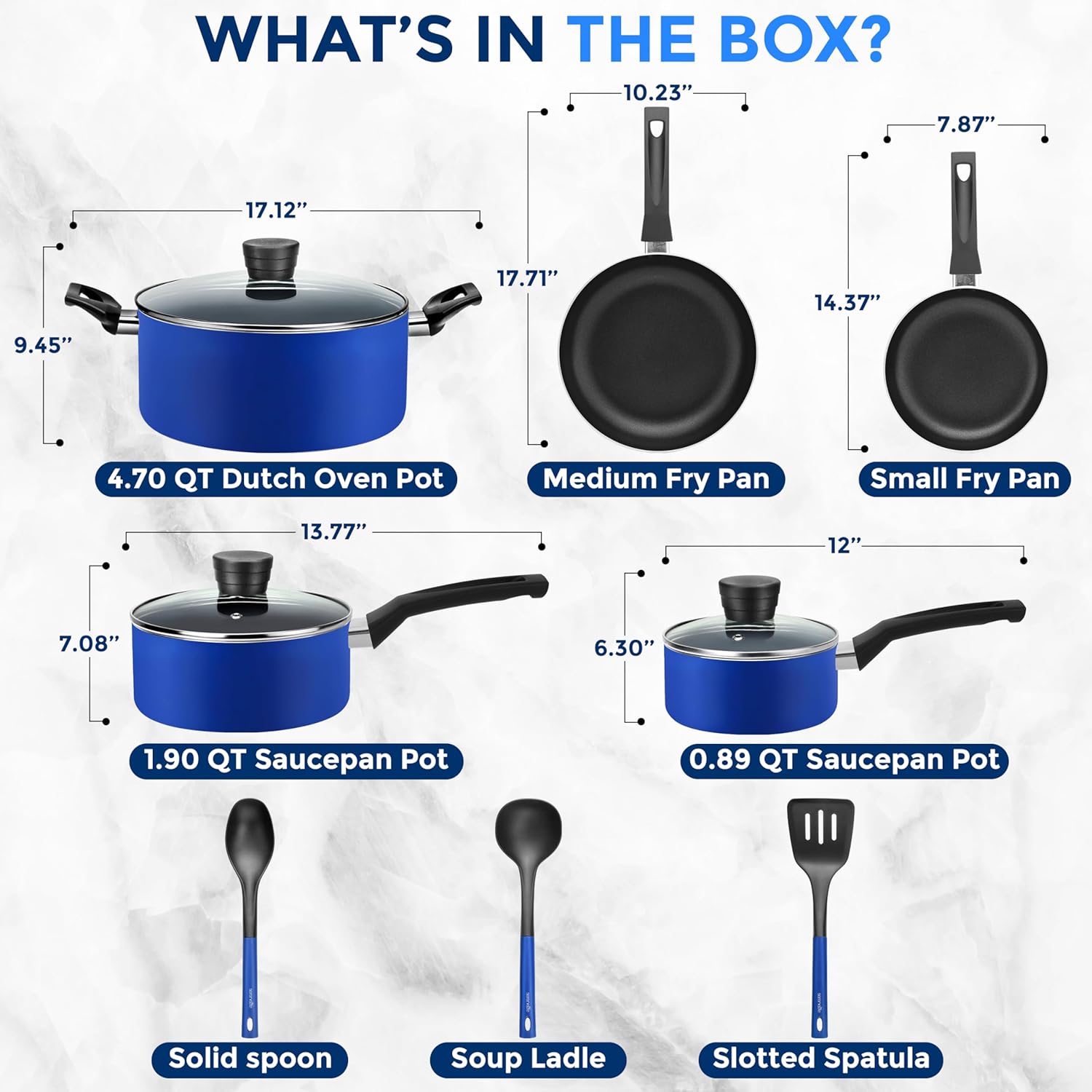- 11-PIECE SET: The SereneLife Home Basic Kitchen Cookware Set features 11-piece nonstick cookware set which includes 0.89 & 1.90qt sauce pots w/ lids, 4.70qt dutch oven pot w/ lid, 8-inch & 10-inch fry pans, solid spoon, slotted spatula & soup ladle