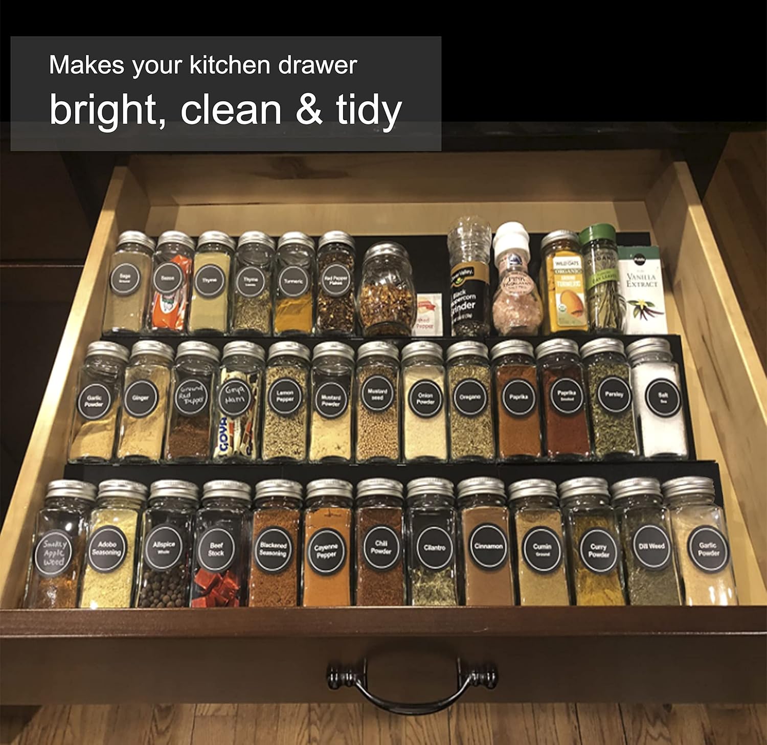 - Fit Perfectly in Most Cabinet Drawers - Neatly arrange your spices, no messing, identify their contents and locate the item you need. Create more space in cluttered kitchen cabinet drawer organizer as well on pantries, cabinets, shelves, or cupboards or on countertops with this very functional tiered shelf organizer.
