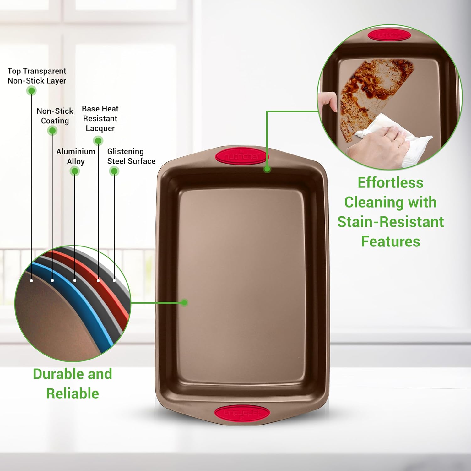 NutriChef 6-Piece Baking Pan Set - PFOA, PFOS, PTFE Free Flexible Nonstick Golden Coating Carbon Steel Bakeware - Professional Home Kitchen Bake Cookie Sheet Stackable Tray w/Red Silicone Handles