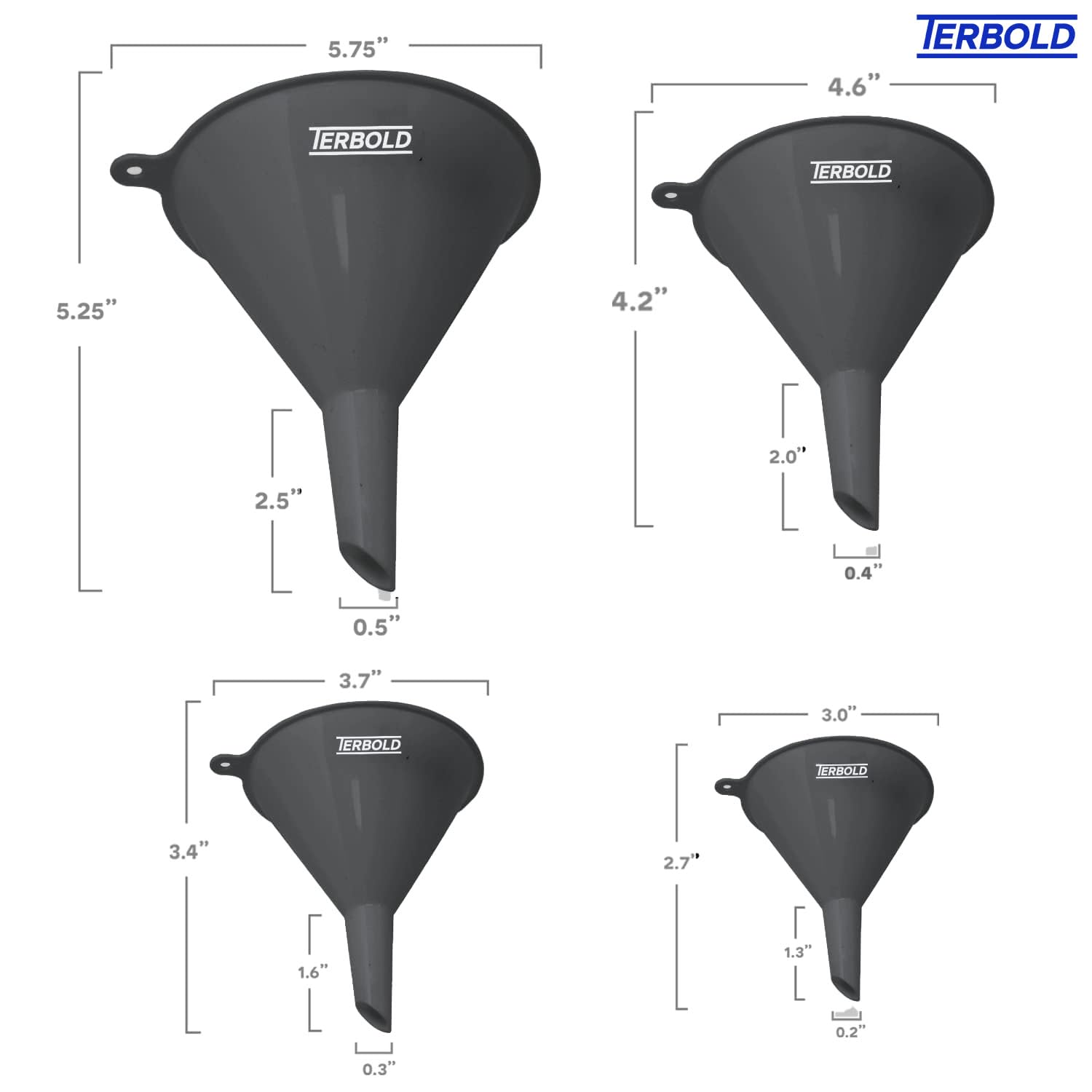 - COMPLETE SET | Having the correct funnel size matters when you need careful, precise transfers of liquids and powders. This set includes 125mm, 100mm, 75mm, and 55mm wide diameters