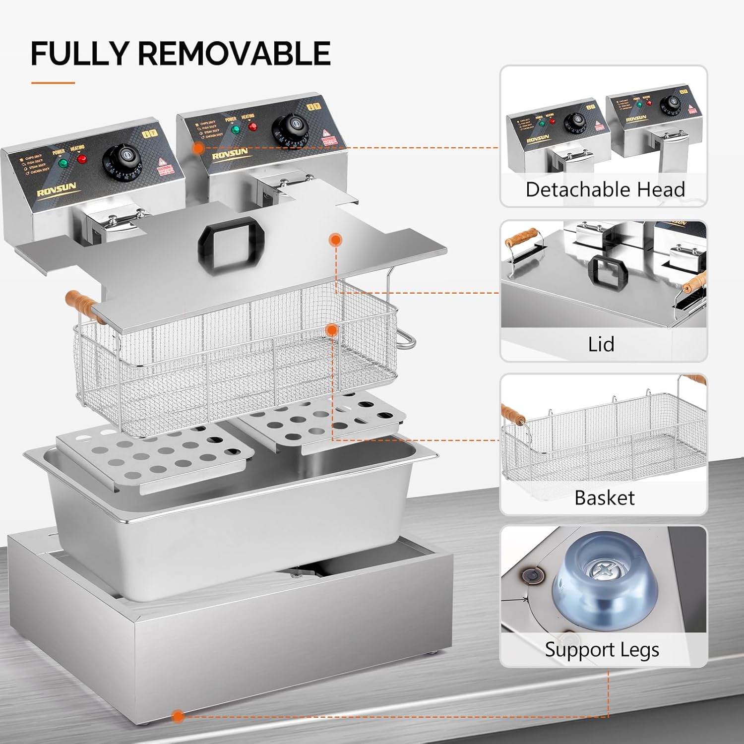 - APPLICABLE ON VARIOUS OCCASIONS: The deep fryer with basket is perfect for commercial use, such as restaurants, supermarkets, fast food stands, snack bars, parties, etc. And its overall dimension is about (21.7 x 17.3 x 12.2)" / (55 x 44 x 31)cm(L x W x H). Max Power: 5000W (2500W For Each Head). (Note: It needs at least 16A outlet to support it.)