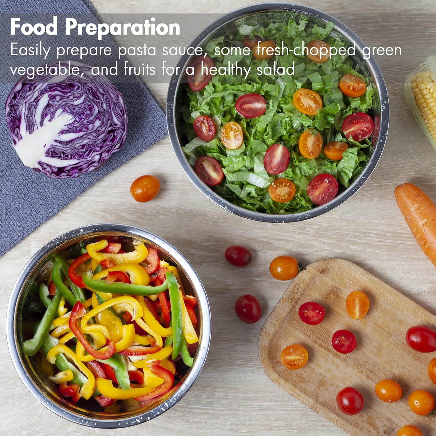 - Make Your Cooking Much Easier — Multi-purpose, stainless steel mixing bowl is essential to your everyday kitchen needs,7 different sizes of 4.5, 3.6, 2.7, 2.1, 1.7, 1.1, 0.7Qt will complement your cooking and make cooking much easier. Ideal for making a quick salad, preparing food, mixing batters, or storing and serving food.