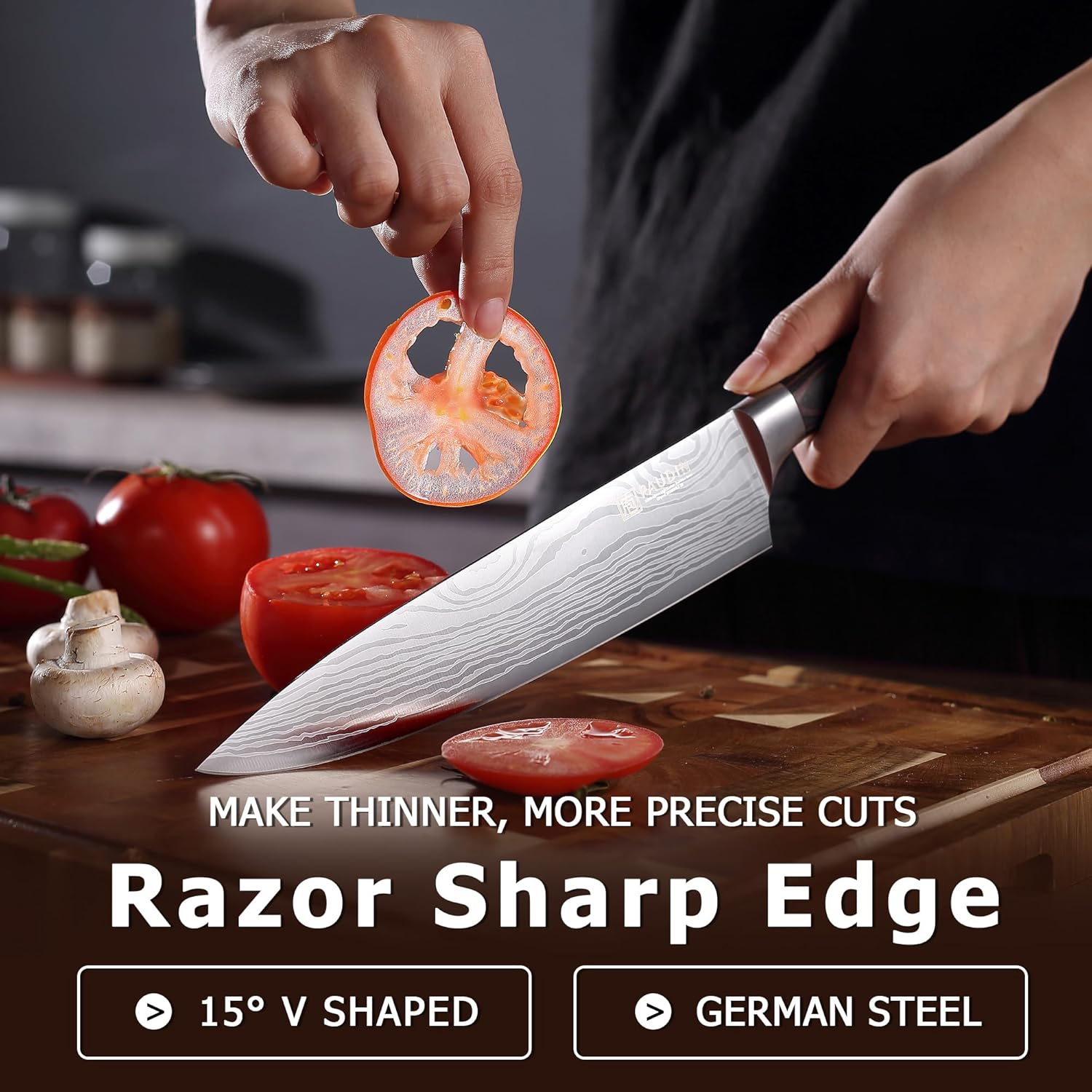 - Sharp Performance: Professional satin finish for optimum sharpness. Each knife is further finely hand-sharpened, 14-degree V-shaped blade per side for a sharper edge. 54+ Rockwell hardness provides double the sharp edge retention. The razor-sharp kitchen knife sets to assist you with all your kitchen cutting tasks. A comprehensive kitchen knives collocation allows you to easily deal with a variety of foods