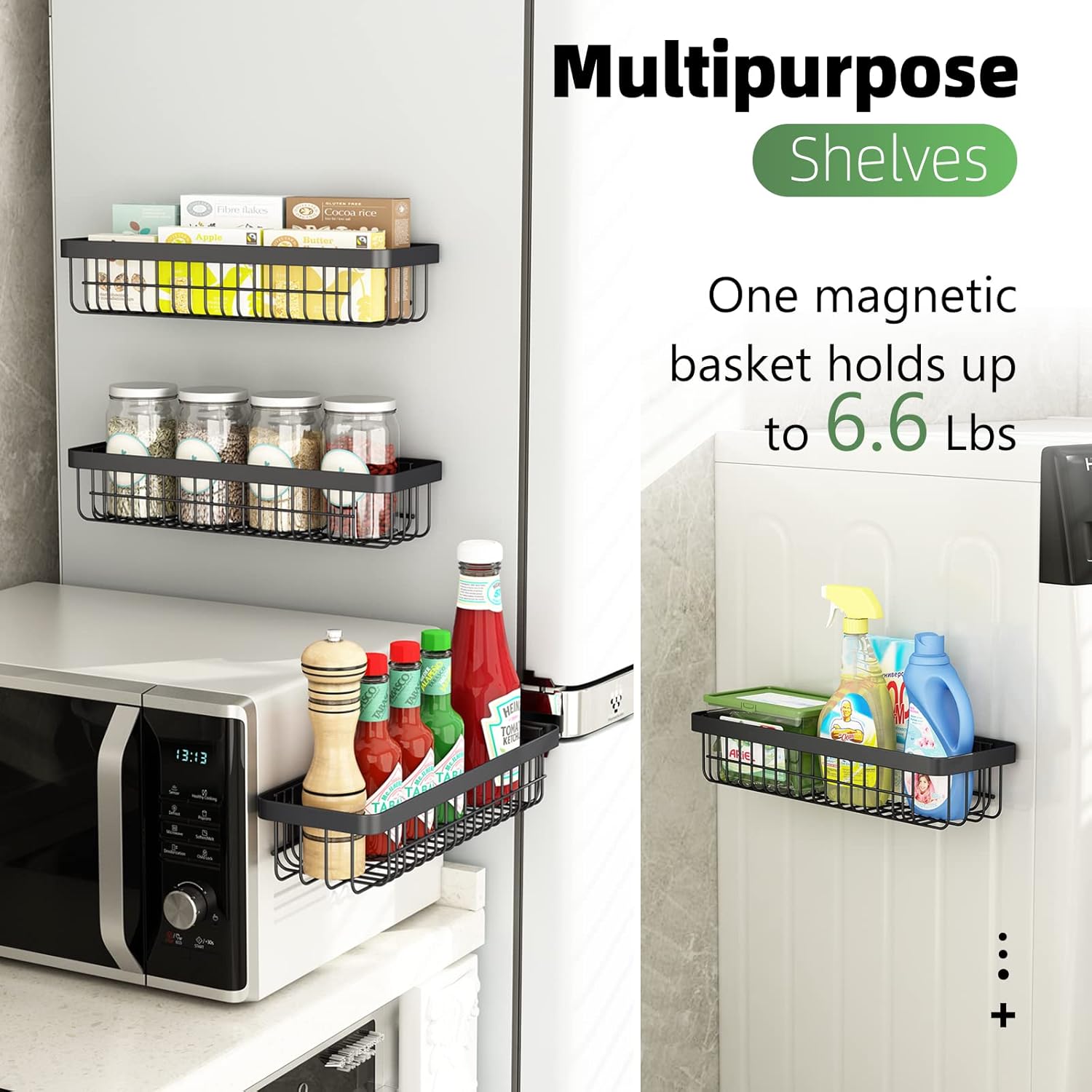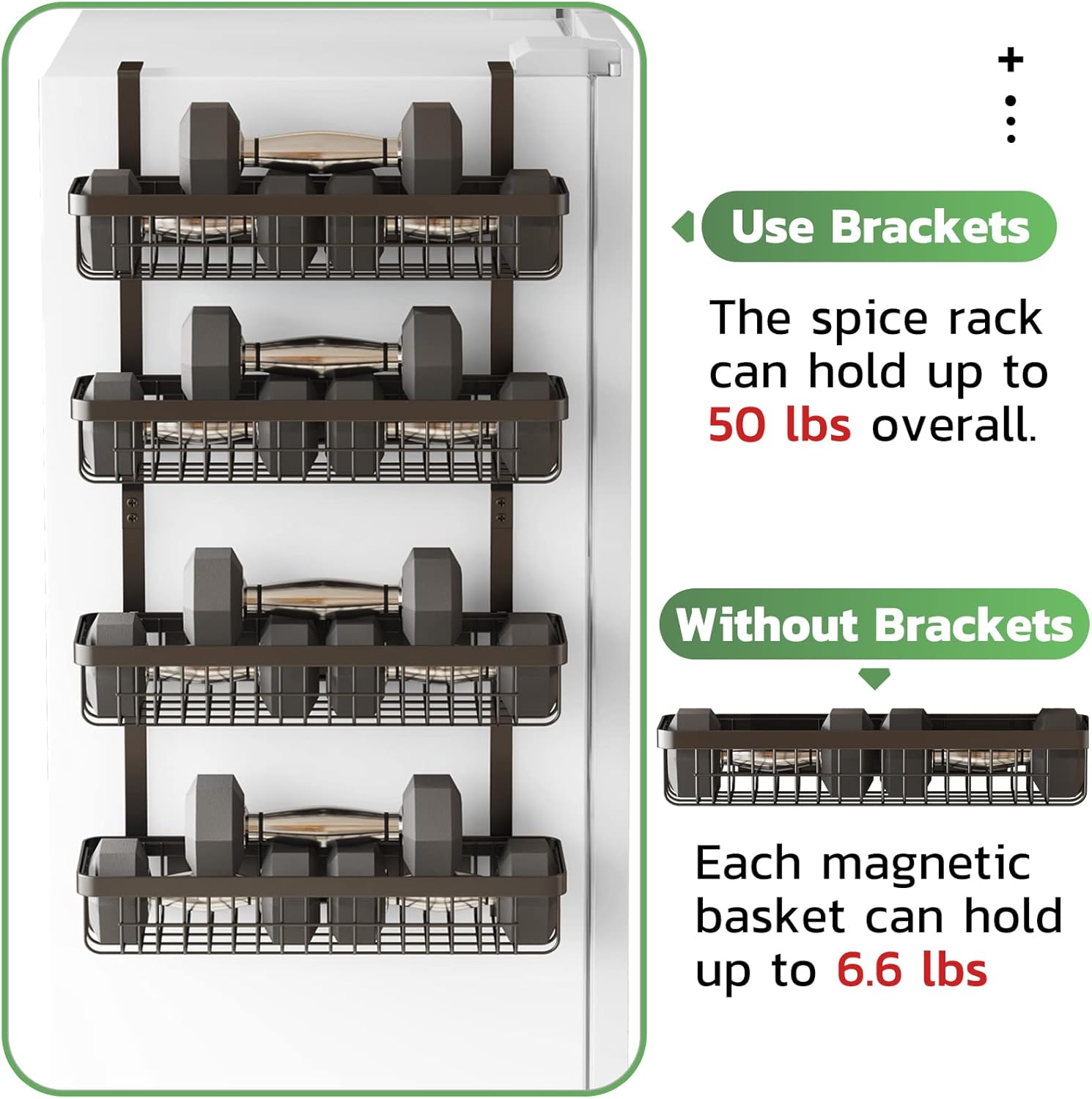 - Magnetic Shelves with Super High Load Capacity - The spice rack has a super strong magnet on the back that can hold up to 6.6 pounds. If you need a higher weight capacity, you can add our hanging rod when you use the magnetic basket and the overall weight capacity can be increased to 50 lbs.