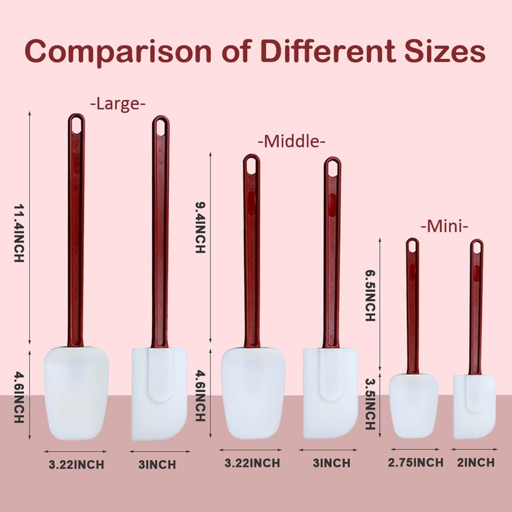 - 【Quality Material】 These silicone spatulas are made of 100% food-grade silicone blade and nylon handle, can withstand temperatures up to 500 degrees Fahrenheit. This spatula does not stain or fade or discolor, is odorless, durable, and will not crack when used in high temperatures. Meets NSF standards, 100% food safe