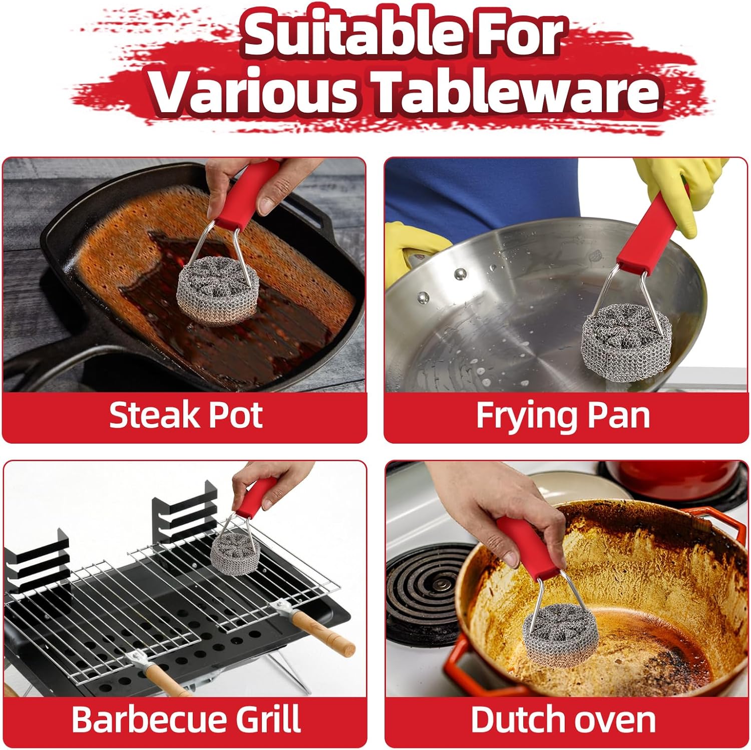 - ERGONOMIC DESIGN - 4 in 1 pattern and all rings welded closed with other rings, what means the chainmail scrubber willl never fall apart in daily use. The handle design for a better grip, these cleaners keep your hands away from the chain mail leading to less fatigue. The easy on the hands, flexible chainmail scrubber gets into any corner or crevice and is suitable for all cookware: pots, pans, grills, griddles, even BBQ mesh.