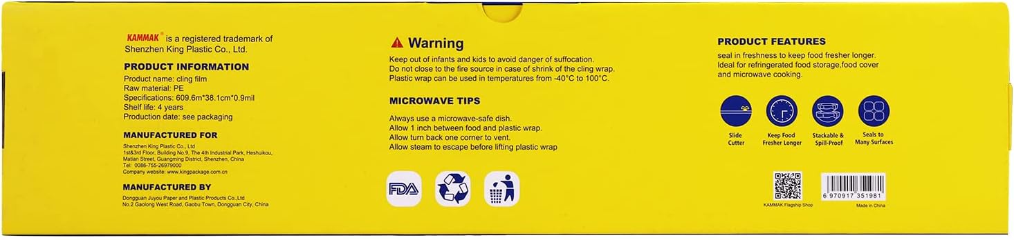- SANITARY: The restaurant grade kitchen plastic wrap is great for keeping moisture and dirt out. Keeping your food and treats fresh and clean. The crystal clear quality keeps your gifts Alluring