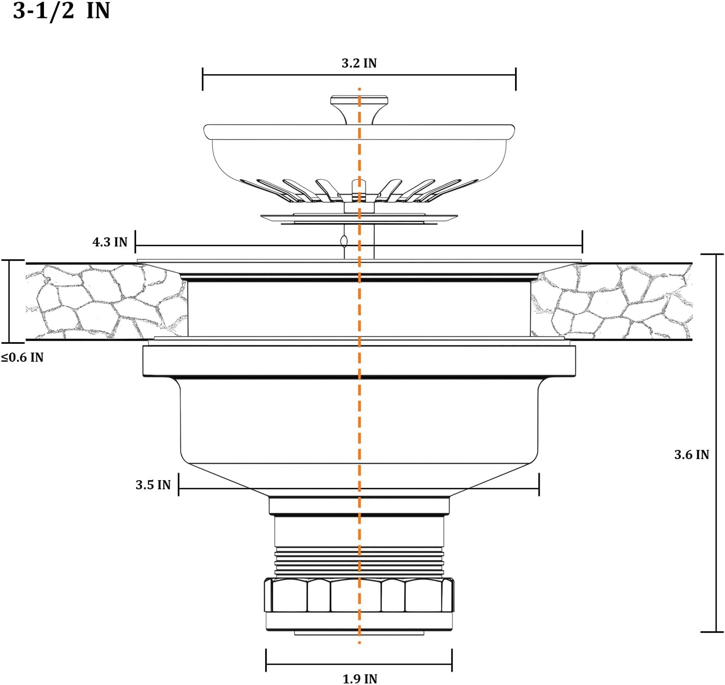 - 3-1/2 INCH KITCHEN SINK DRAIN: Fits for all standard American sink drain with 3.5 inch drain hole. This kitchen sink drain assembly combines solid construction with ease of use