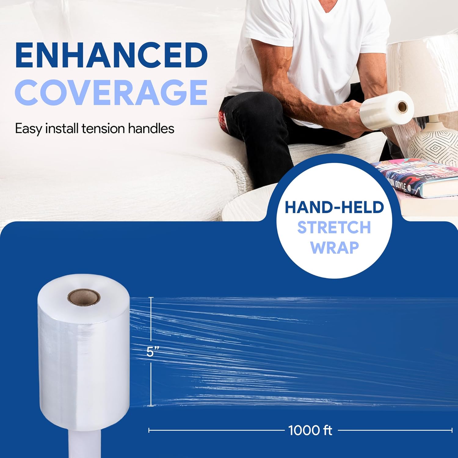 - CONQUER MOVING DAY: Wrap, bundle, and secure all your belongings with ease using this 12 pack of 5" x 1000 ft stretch film with 3" core. Move with confidence knowing your items are protected!