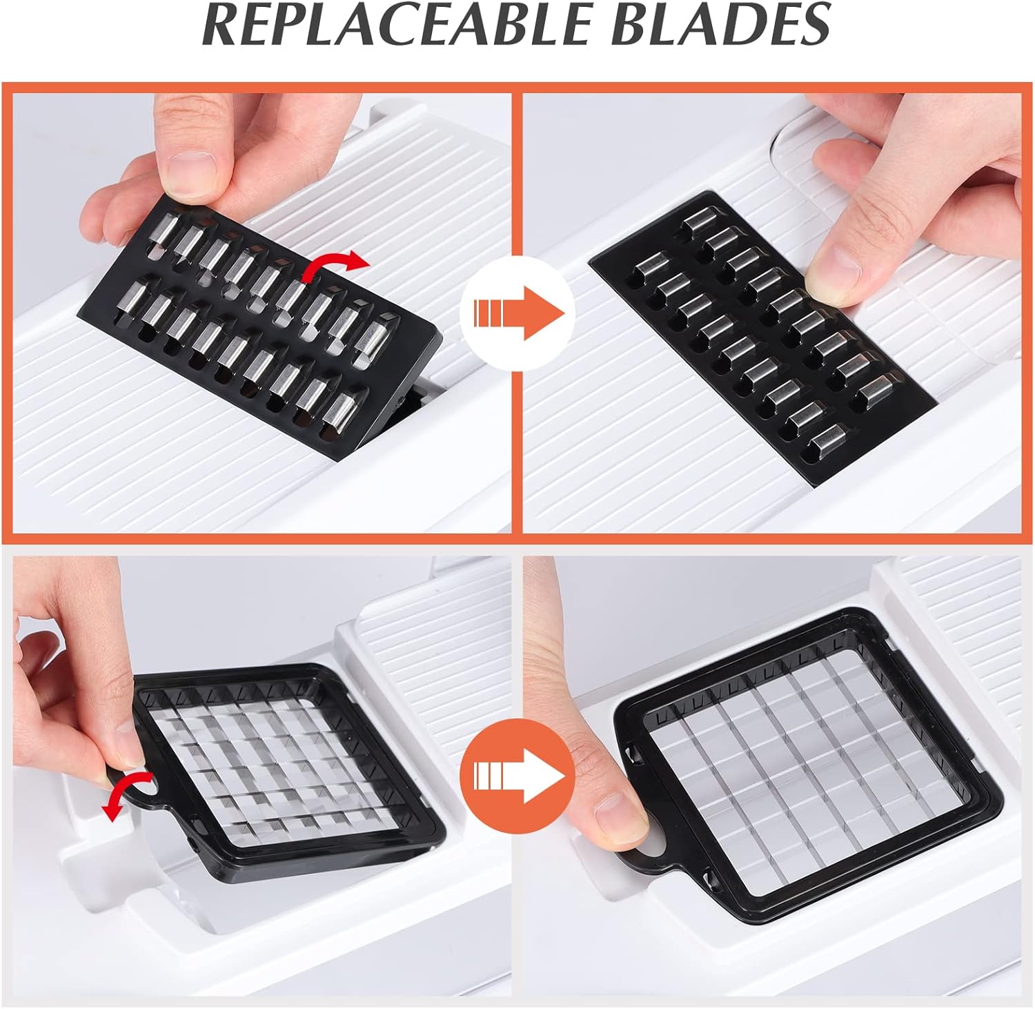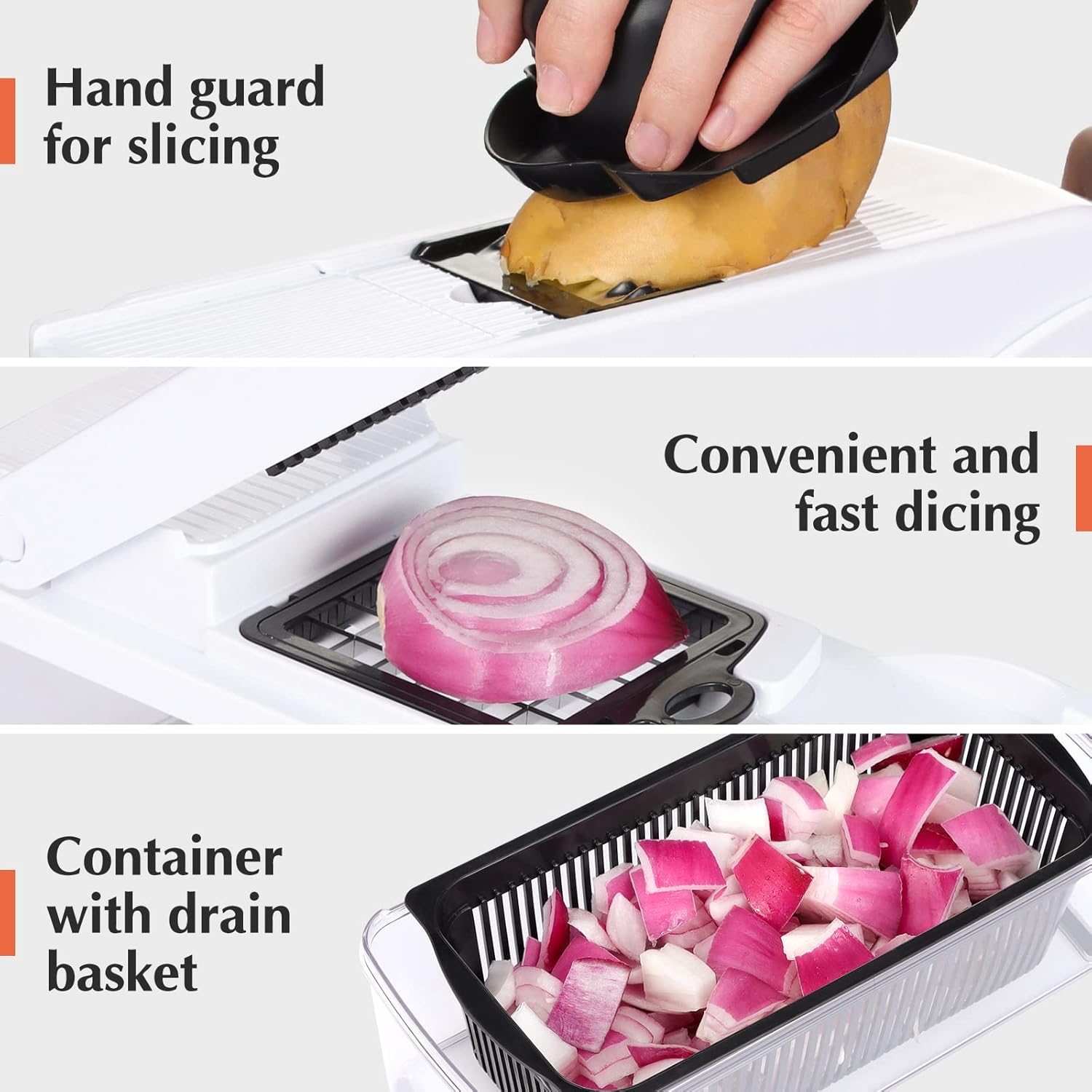 - 🧅Save Time in Preparing Veggies: Vegetable chopper and dicer in one, 10 changeable blades let you shred, chop, dice, and slice veggies. Meet all your chopping needs. It can get the job done all at one time and save you time for half. If you want to dice an onion, easily done in under a minute.