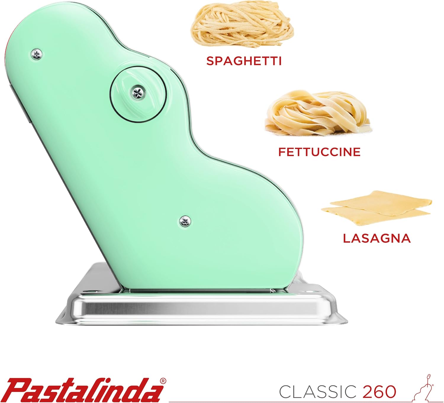 PASTALINDA Classic 260 Pasta Maker Machine, 26 cm Wide Rollers, 9 Thickness Positions, 2 Cutting Positions, Stainless Steel. Includes Reinforced Hand Crank And Two Clamps (Pastel Green)