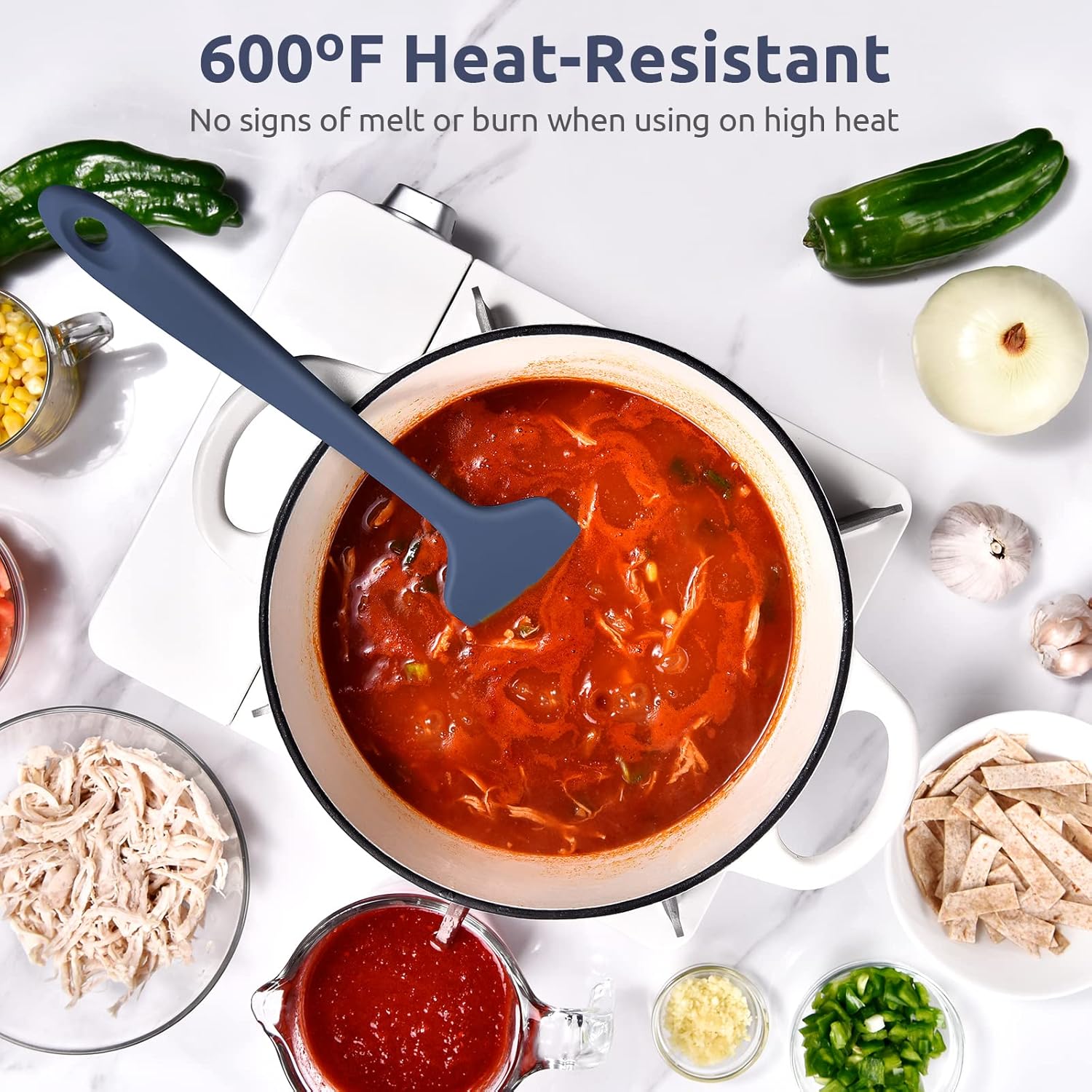 - [600ºF Heat-Resistant for High Heat Cooking] With up to 600 degrees heat resistance, you can use this nonstick silicone spatula in a hot pan without worrying about melted plastic in your dinner. It also works well with high temp sugars, chocolates or sauces. A must for newer cooks who might tend to leave utensils in a nonstick pot while cooking. You can use this heat safe silicone scraper daily for everything from stirring to frying to smoothing.