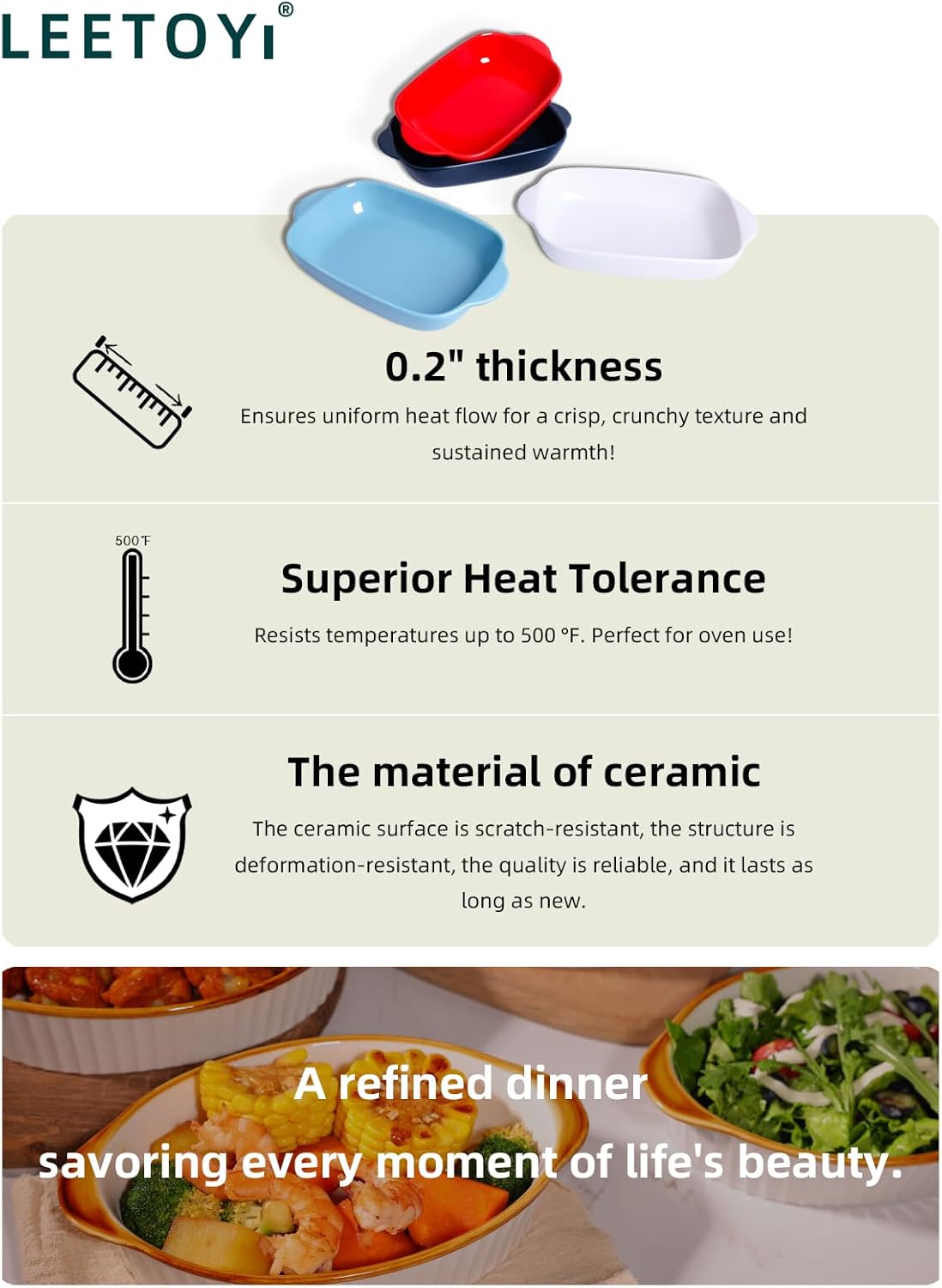 - Ceramics:This Baking Dish is made of ceramic. The baking set surface is smooth and bright, and it is very easy to clean.At the same time,It can be used in the oven, microwave, freezer and dishwasher