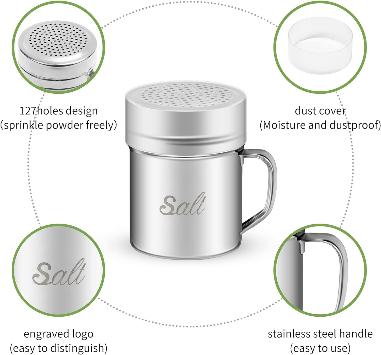 Stainless Steel Salt and Pepper Shakers Set, 10 OZ Seasoning Spice Shaker with Lid and Handle 127 Holes, Metal Dredge Shaker for Powder Sugar Cooking Kitchen Baking (2 Pieces)
