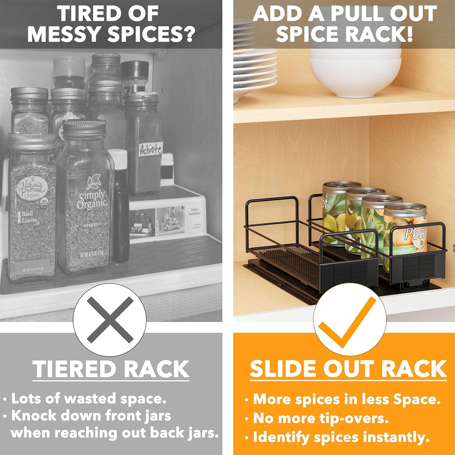 - HEAVY DUTY SPICE RACK FOR CABINET - Ball bearing glides ensure smooth sliding. Full extension glides offer you easy complete access to all spices inside the kitchen upper cabinets. Bottom panel is designed to clear any cabinet lip.