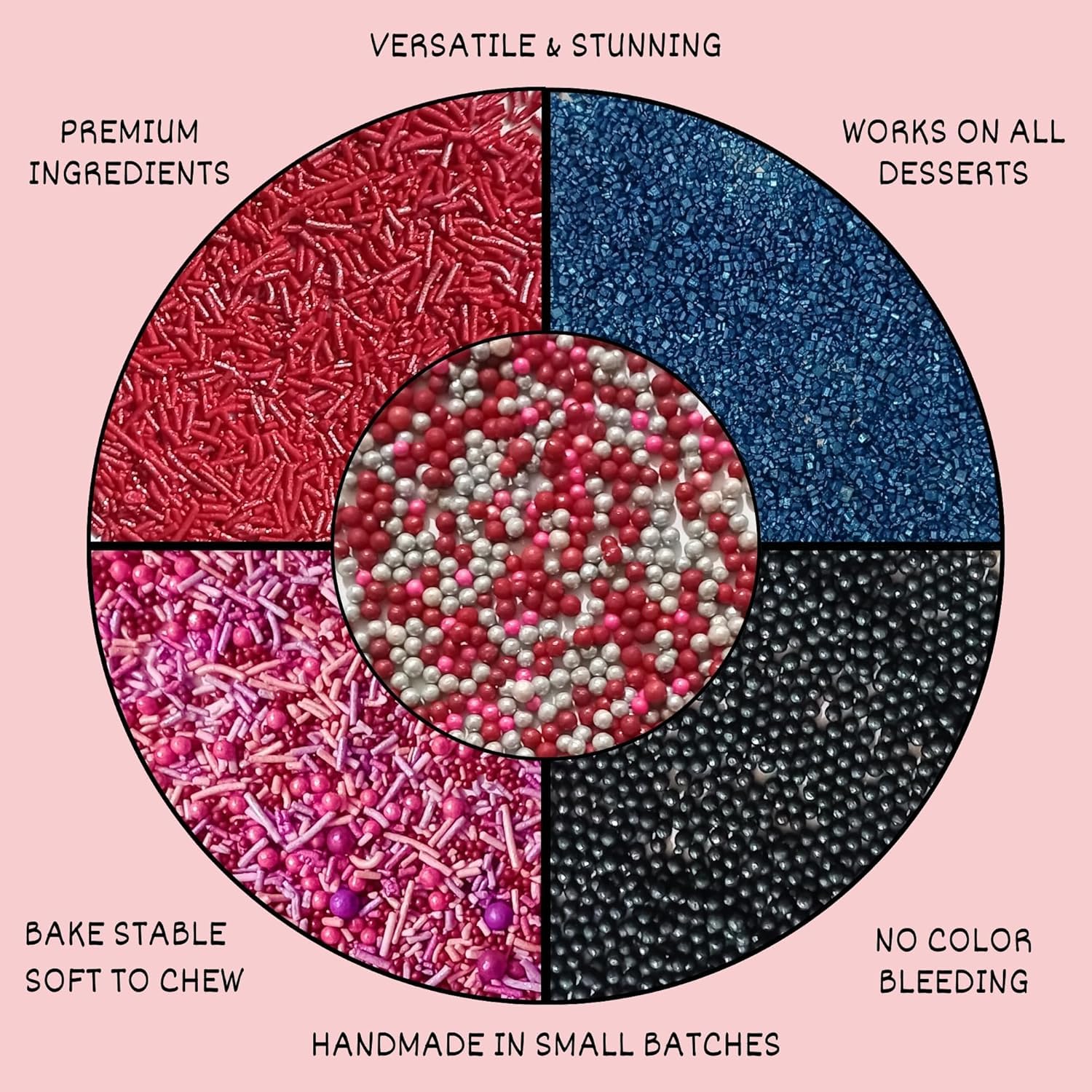 Confect Edible Sprinkles for Cake Decorating - Red Jimmies, Blush Pink Red Gun Metal Silver Pearl Mix with Navy Sparkling Sugar | Vegan, Gluten-Free, Dessert Topping - 5 Oz