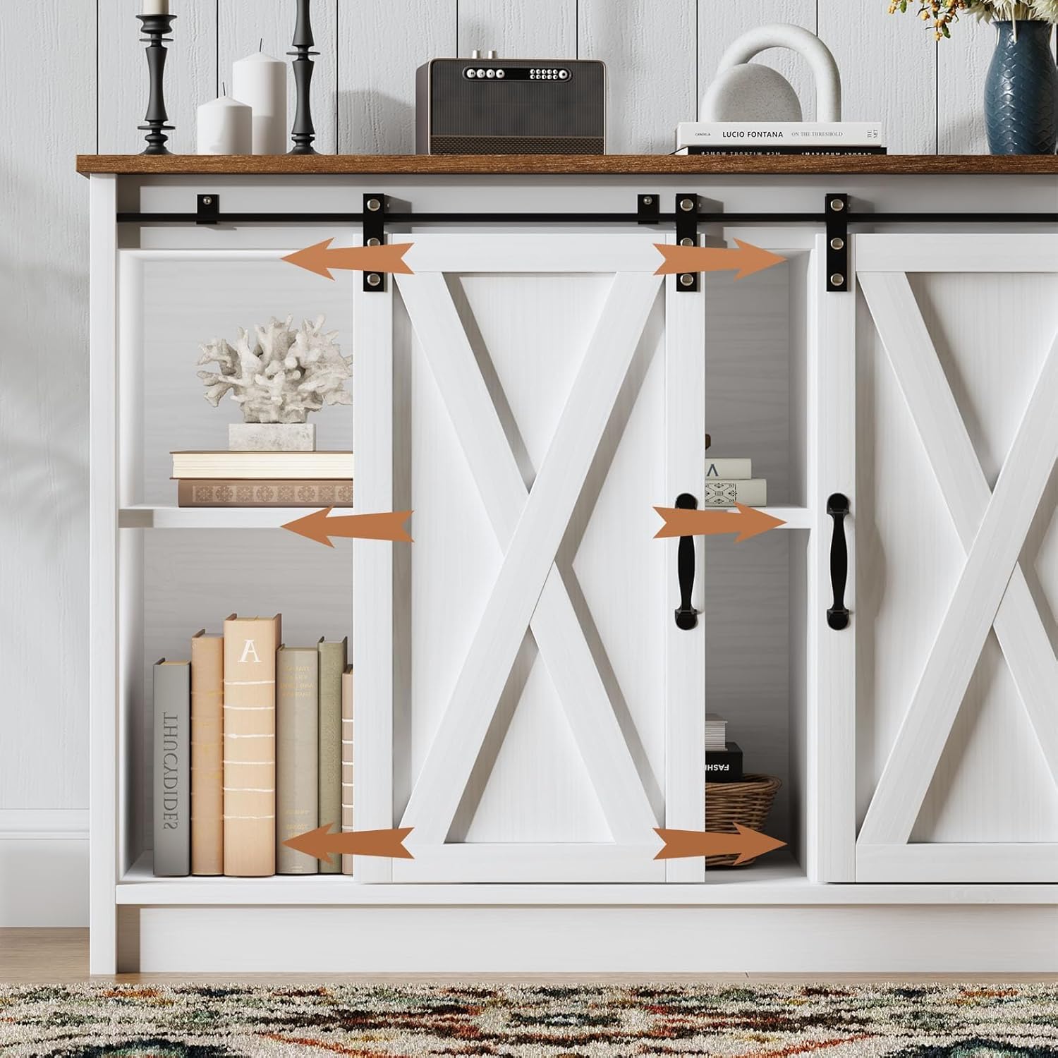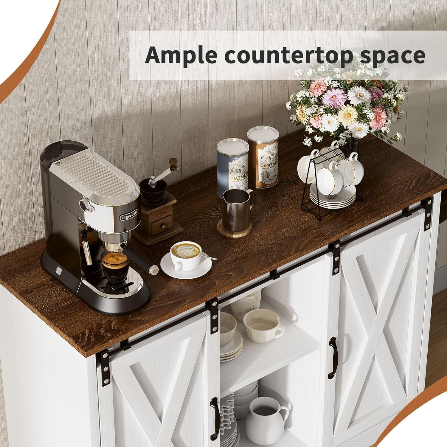 4 EVER WINNER Coffee Bar Cabinet with Sliding Barn Doors, 42”Farmhouse Buffet Cabinet with Storage for Kitchen, Coffee Bar with Adjustable Shelf for Dining Room, White