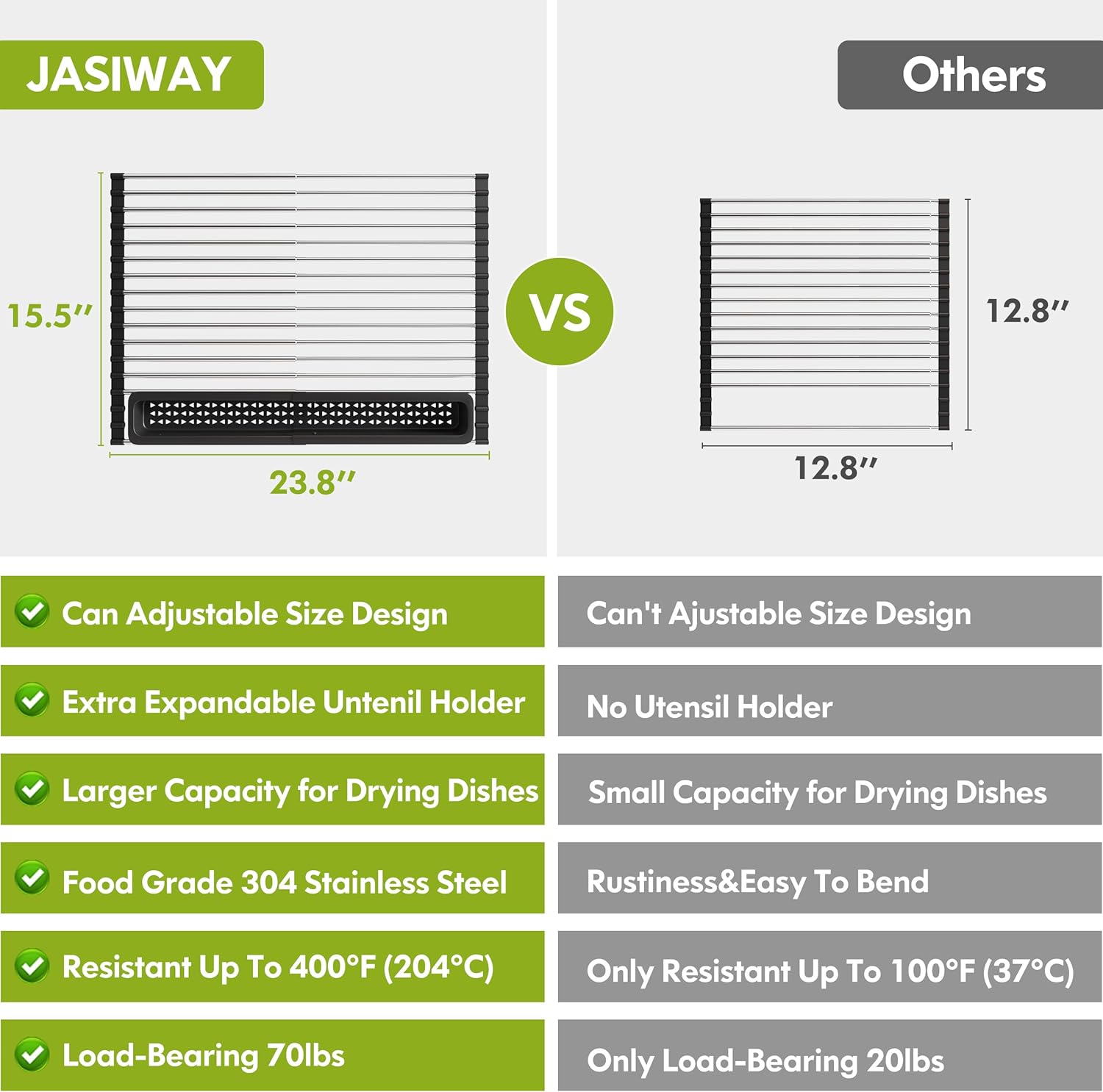 JASIWAY Dish Drying Rack, Roll Up Dryer Rack for Inside Sink, Expandable (12.8"-23.8" D x 15.5" W) 304 Stainless Steel Dish Drainers for Kitchen Counter, Over Sink Cover with Utensil Holder