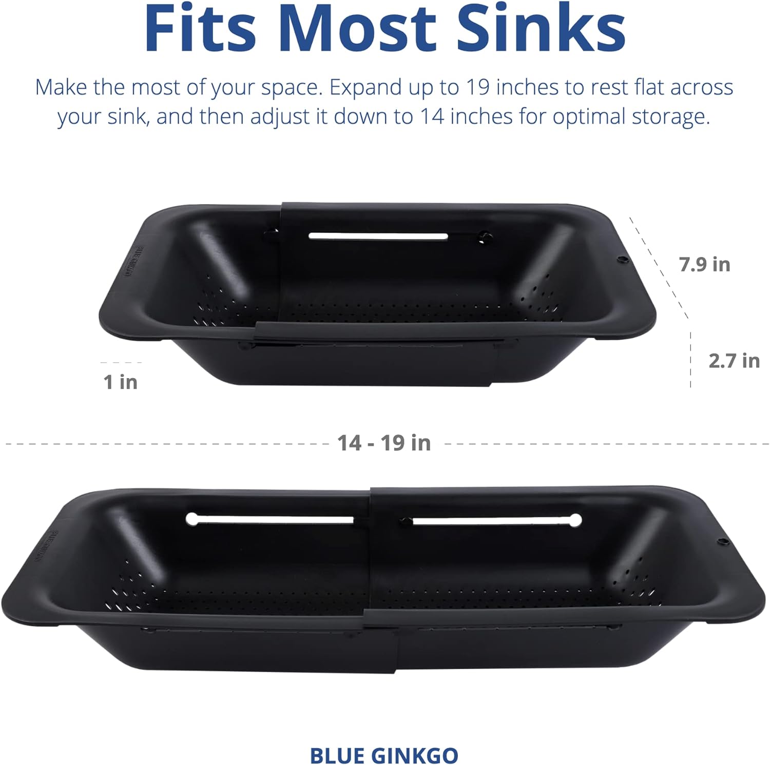 BLUE GINKGO Sink Colander Baskets - (Pack of 2) Wash Vegetables and Fruits, Drain Cooked Pasta and Dry Dishes - Extendable - New Home Kitchen Essentials (2 Black)