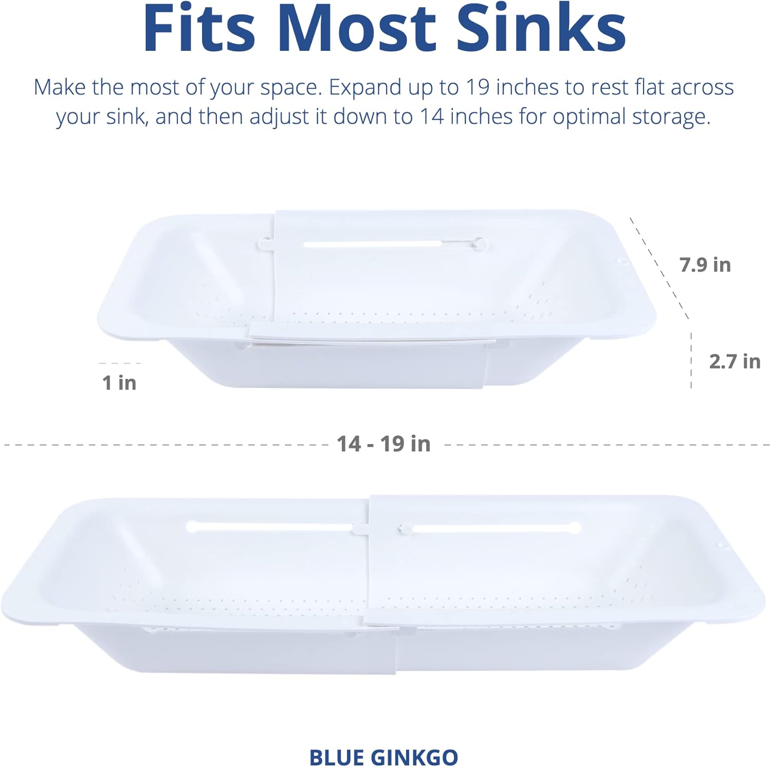 - Modern Design - Adjustable, this colander expands from 14 to 19 inches to hold more or less, save space when not in use and fit most sinks. When stretched over the sink, the bottom is raised from your sink base, preventing drained pasta water from backing up into your food.