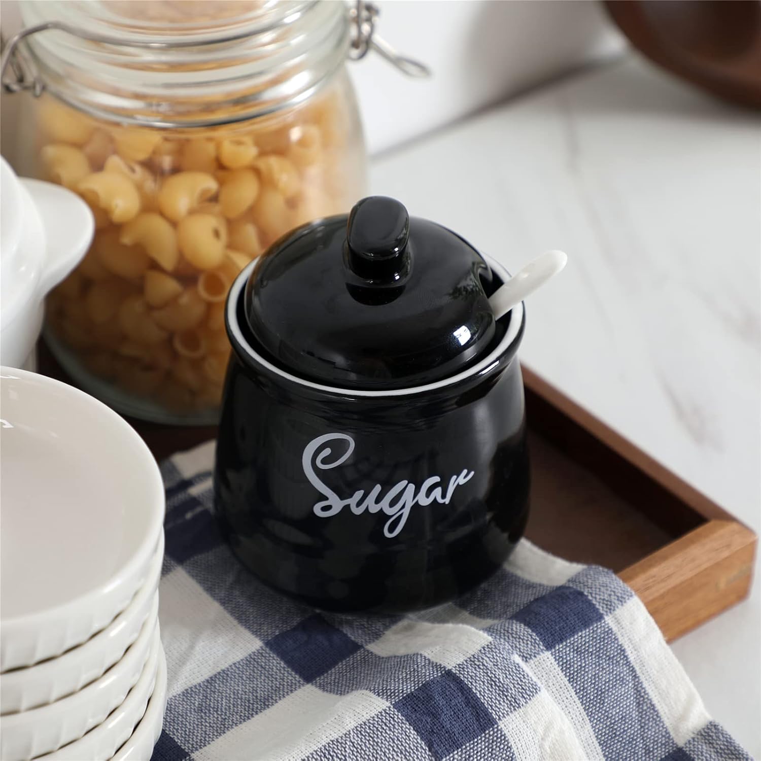 - PERFECT COMBINATION: This sugar bowl is equipped with a perfect lid and a small spoon. The lid can keep your ingredients away from dust. There is a perfect notch on the lid for placing the spoon, so you don’t have to worry about placing the spoon randomly