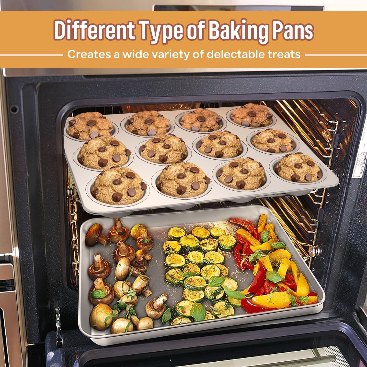 - VERSATILE BAKING PANS - Different baking pans create a wide variety of delectable treats - from baking cookies and muffins, cupcakes, loaves to roasting chicken, vegetable, beef etc, Well fit in oven and stack up together easily to save storage space, Idea gift for Christmas, Thanksgiving Day