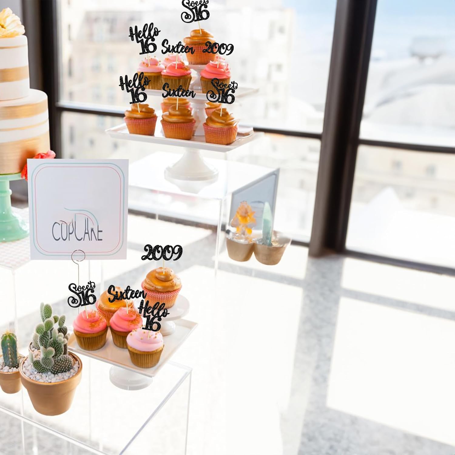 Gyufise 24Pcs Happy 16th Birthday Cupcake Toppers Glitter Hello 16 Sweet 16 Cupcake Picks 2009 Sixteen Old Birthday Cake Decorations for 16th Birthday Anniversary Party Supplies Black