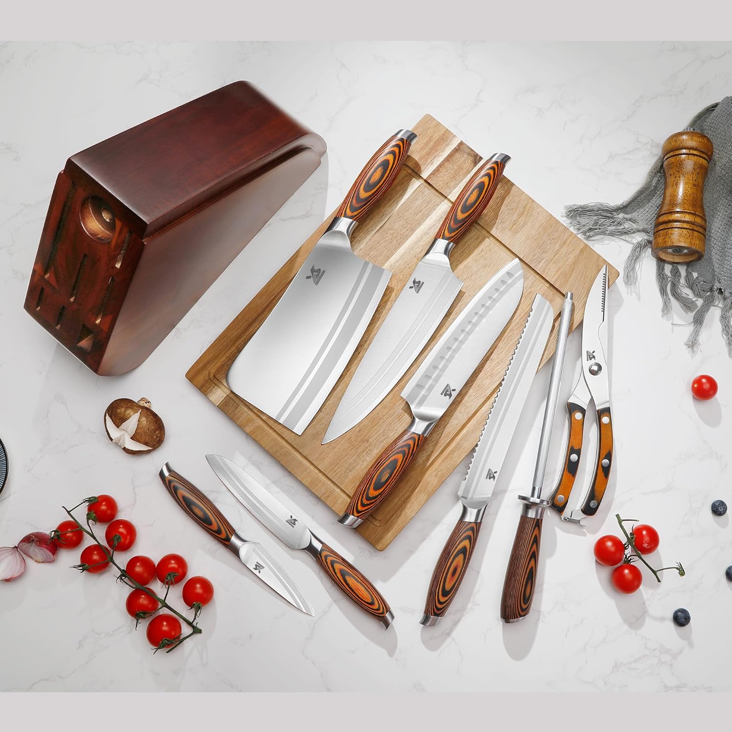 MSY BIGSUNNY 9pcs Knife Block Set, German Steel Kitchen Knife Set with Bone Chopper, Precious Pakkawood Handle for Chef Knife Block Set