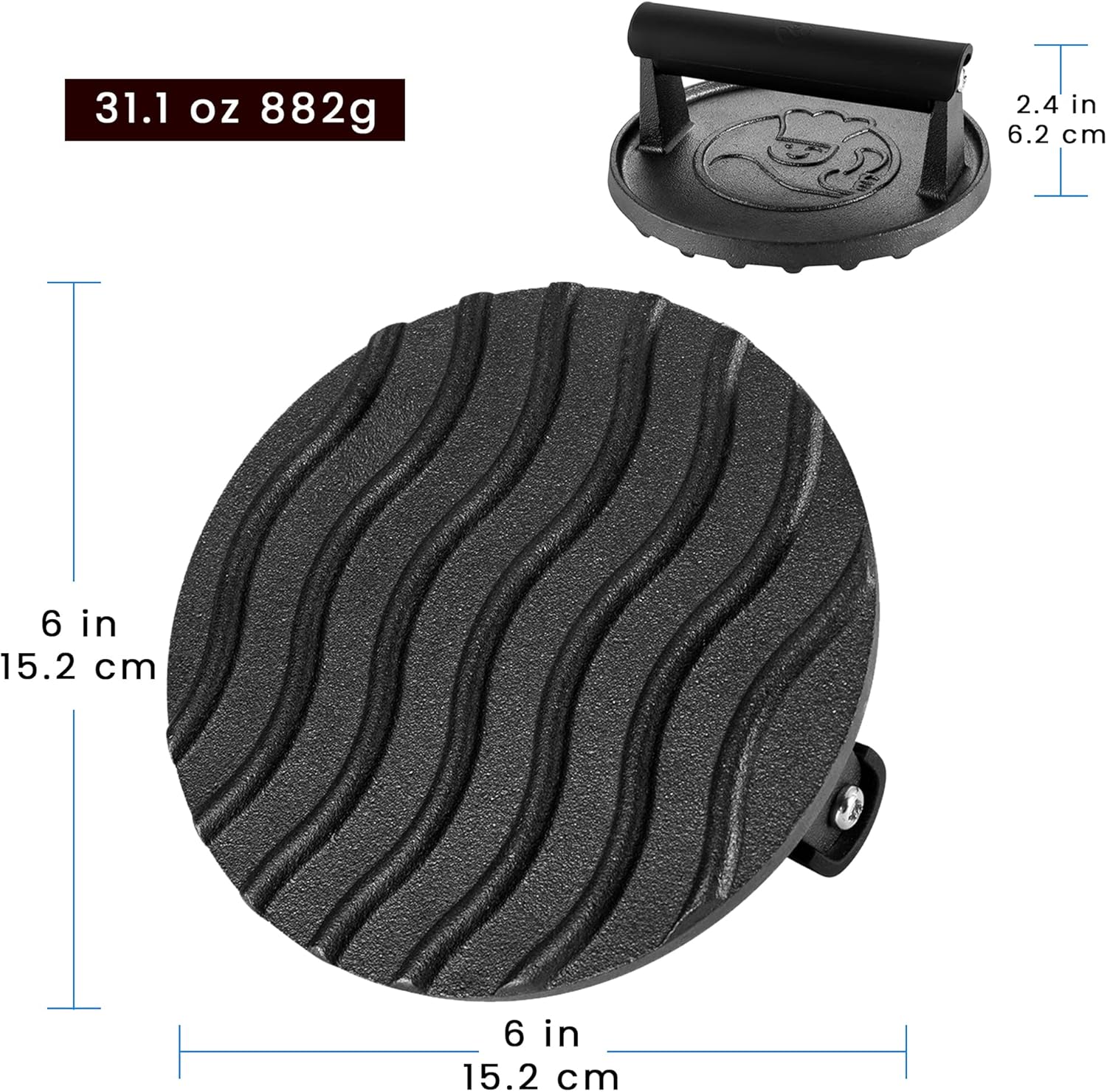 - HEAVY CAST IRON PRESS IN A GIFTABLE PACKAGE: Get ready to gift a tough and well-built griddle press! Our steak press weighs 1.94 lbs with 100% metal construction, designed to last a lifetime. With a heat-resistant silicone handle, it's easy to move around your griddle surface with a comfortable grip.