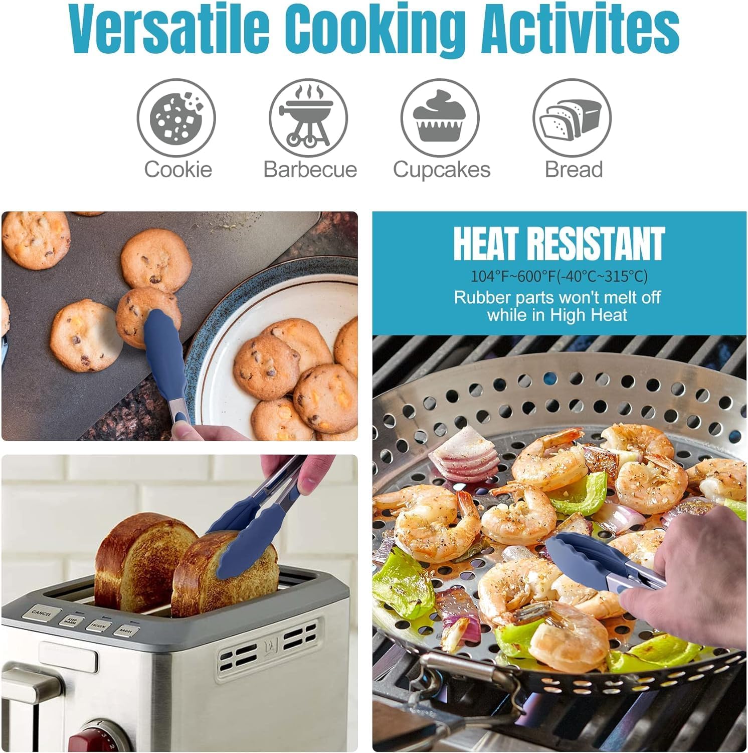 - EASY TO USE: The cooking tongs' handle is cushioned with silicon, good for thumb rest and ensures good grip and control. The Food Grade silicon tongs tip is heat resistance 600°F and less prone to scratch the pan. Easy to rinse, dishwasher safe.
