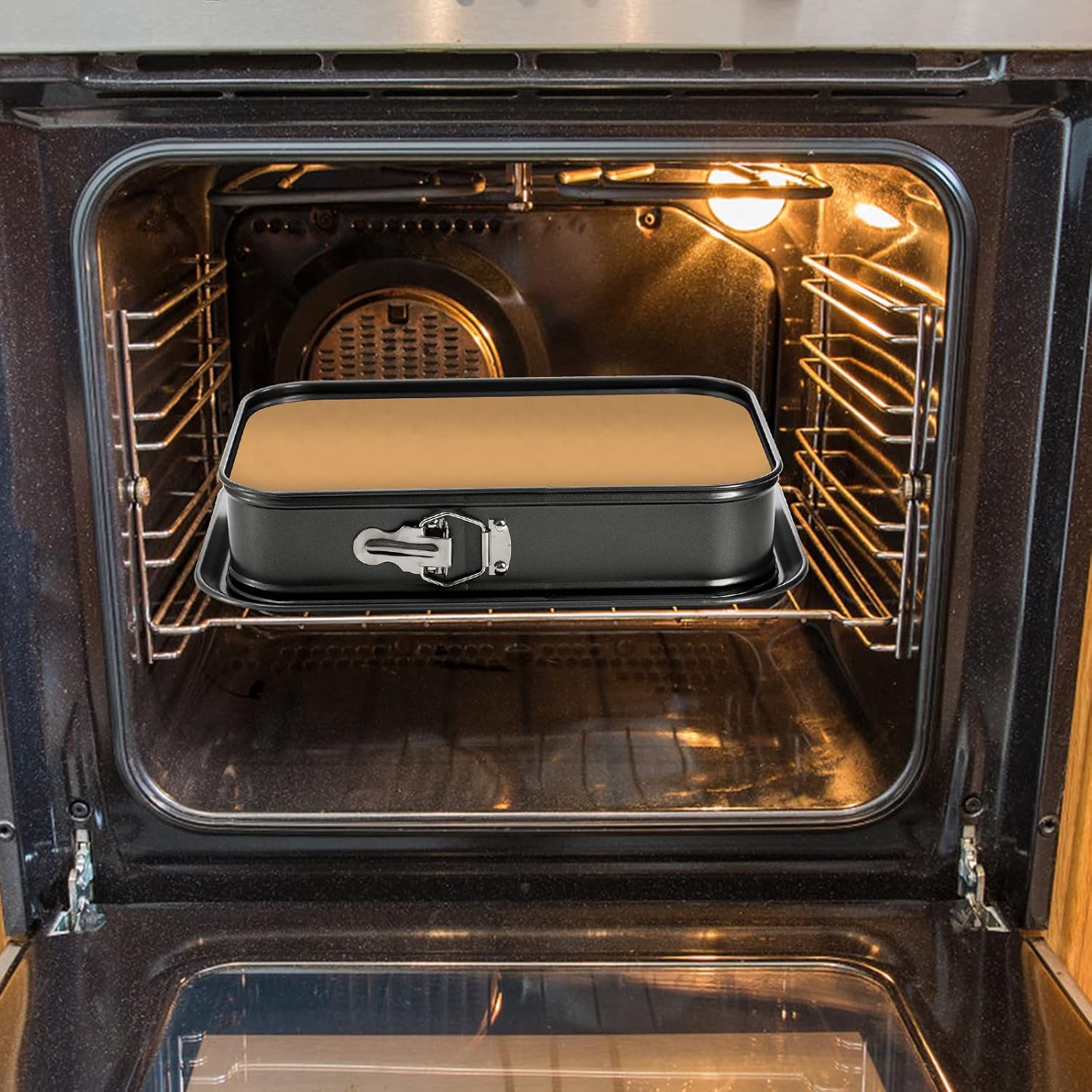 - Ideal Size: 14"L x 9.2"W x 3"H, bottom: 15.5''L x 11''W, large capacity for cake. Springform securely holds form together, prevents the batter from messy spills
