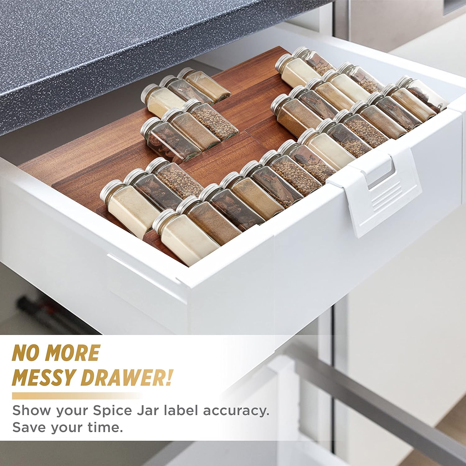 - Efficient Space Saver: Maximize your drawer space by storing your spices horizontally, allowing you to easily see and access each jar. The tiered design ensures that all labels are visible at a glance,