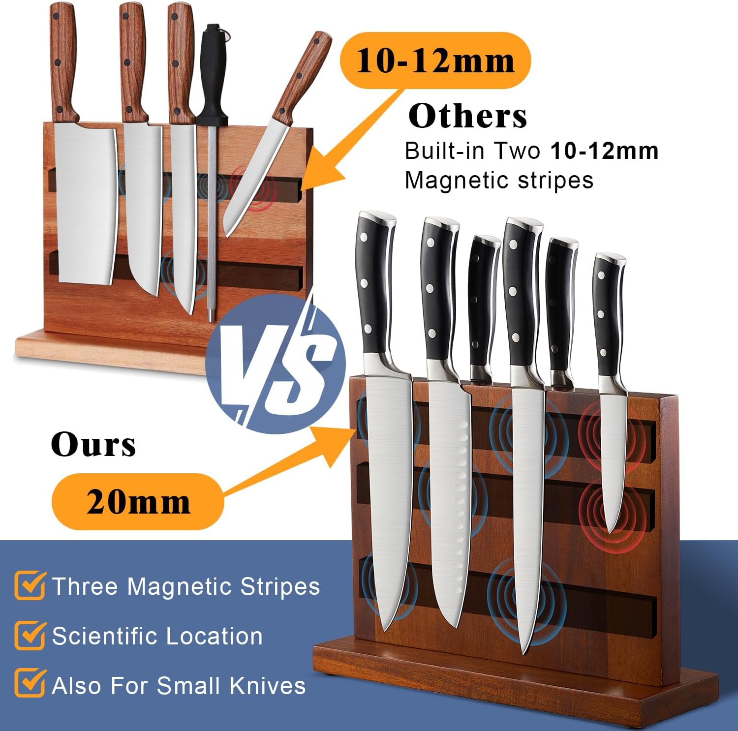 ENOKING Magnetic Knife Block 12.5 x 9 Inches, Double Side Magnetic Knife Holder Built in Three Powerful Magnets Strip, Acacia Wood Universal Knife Storage Organizer for Kitchen Counter