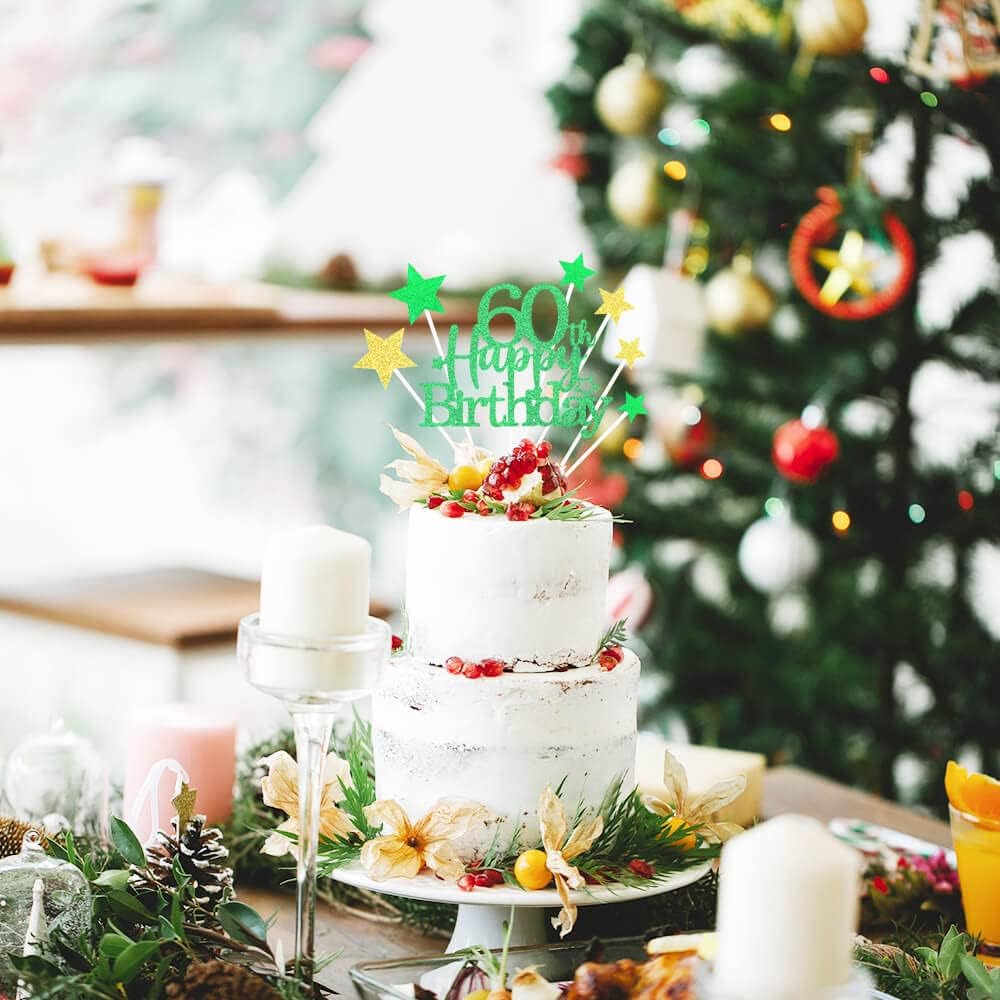 Glittery 60th Happy Birthday Cake Topper with Star,Personalised 60 Birthday Cake Toppers Party Decorations Party Supplies for Boys Girls Green Gold