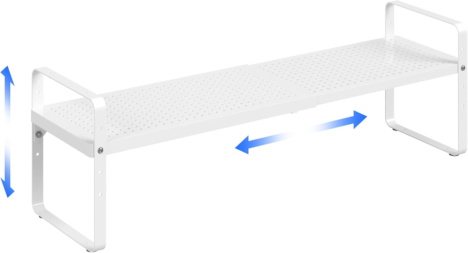 Expandable Cabinet Shelf Organizer Adjustable Metal Spice Rack Stackable Freestanding Counter Storage Shelves for Kitchen Cabinet Under Sink Office Desk (White - 1Pack - L16.5-27'' * W8'' * H9.6'')