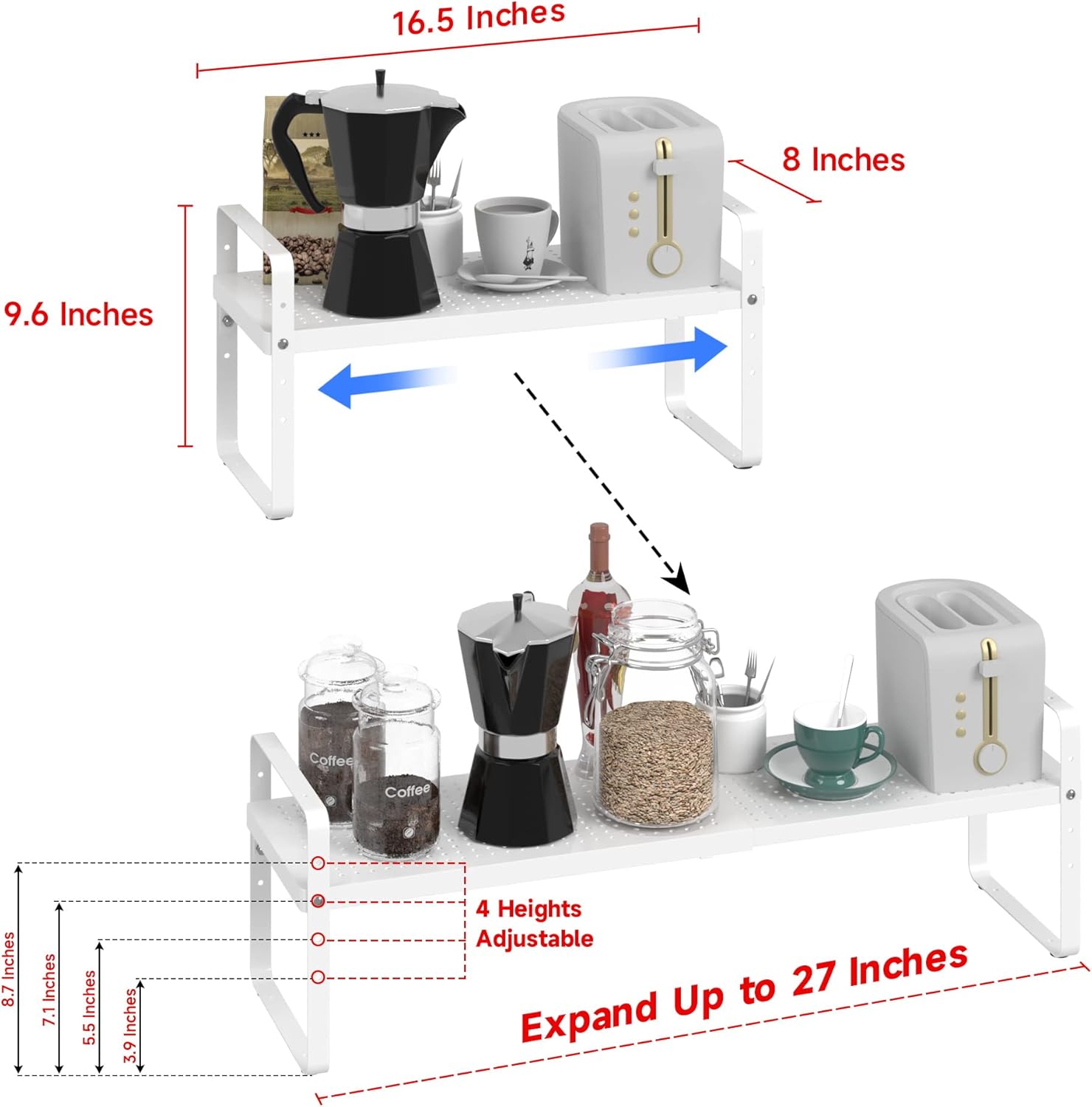 - Expandable &Stackable Cabinet Shelf Organizer: The width and height of the expandable kitchen cabinet shelves can be adjusted according to your needs, which is a very practical storage shelf. The dimensions before expansion are 16.5 "L x 8" W x 9.6 "H. Its length can be extended from 16.5" to 27". You can also stack the 2pack shelves together to form a two-layer storage space. Or it can be used as 2 single shelves separately